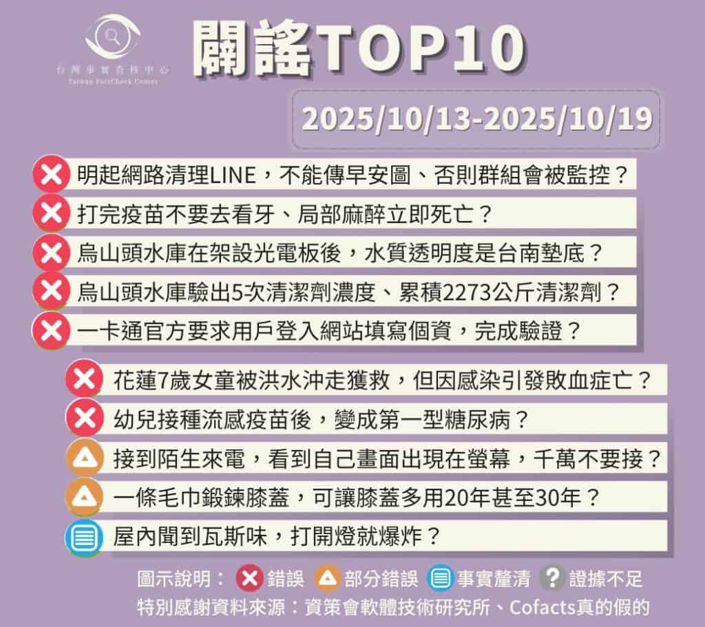 生活 台灣目前沒有掃描路邊停車QR Code繳費單遭詐騙案例 發佈日期: 2025-10-23 環境能源 光電板布滿鳥糞圖非烏山頭水庫 水庫原水經淨水場消毒才成為自來水 健康 接種流感疫苗後並無不能麻醉、吃海鮮等禁忌 台灣目前沒有掃描路邊停車QR Code繳費單遭詐騙案例發佈日期: 2025-10-23光電板布滿鳥糞圖非烏山頭水庫 水庫原水經淨水場消毒才成為自來水發佈日期: 2025-10-21接種流感疫苗後並無不能麻醉、吃海鮮等禁忌發佈日期: 2025-10-20 更多查核報告 編輯推薦 每週謠言TOP10【2025/10/13-2025/10/19】闢謠TOP10發佈日期: 2025-10-20議題觀察室非洲豬瘟疑現蹤台灣 豬肉食安的7大提問發佈日期: 2025-10-23議題觀察室海底電纜風險升溫:台灣如何避免成為「網路孤島」發佈日期: 2025-10-15Podcast節目林之晨談電信防詐:用退租門號攔截可疑訊息,AI過濾詐騙網址發佈日期: 2025-10-13 每週謠言TOP10【2025/10/13-2025/10/19】闢謠TOP10發佈日期: 2025-10-20 議題觀察室非洲豬瘟疑現蹤台灣 豬肉食安的7大提問議題觀察室海底電纜風險升溫:台灣如何避免成為「網路孤島」Podcast節目林之晨談電信防詐:用退租門號攔截可疑訊息,AI過濾詐騙網址 重點專區 1231231231231231231231231231231231231231231 3211231231231123123123123123123123231231231231231 最新消息及公告 公告與新聞稿2025第五屆青年查證挑戰賽開始報名!只到10/13!公告與新聞稿網路謠言影響疫苗接種意願 查核中心攜手3大醫學會破除假訊息公告與新聞稿台灣事實查核中心如何與Meta合作?常見問題一次答公告與新聞稿查核中心完成臺澎金馬推廣 馬祖特映與教師研習守護資訊環境公告與新聞稿台灣事實查核組織結盟 聯手對抗緊急事件下的資訊亂流公告與新聞稿查核登陸黃金時段!TFC參與公視新節目《哈!真相大白了》 探員接力上場! 最新消息及公告 公告與新聞稿2025第五屆青年查證挑戰賽開始報名!只到10/13!發佈日期: 2025-09-11公告與新聞稿網路謠言影響疫苗接種意願 查核中心攜手3大醫學會破除假訊息發佈日期: 2025-09-10公告與新聞稿台灣事實查核中心如何與Meta合作?常見問題一次答發佈日期: 2025-01-20公告與新聞稿查核中心完成臺澎金馬推廣 馬祖特映與教師研習守護資訊環境發佈日期: 2025-09-02公告與新聞稿台灣事實查核組織結盟 聯手對抗緊急事件下的資訊亂流發佈日期: 2025-05-28公告與新聞稿查核登陸黃金時段!TFC參與公視新節目《哈!真相大白了》 探員接力上場!發佈日期: 2025-07-22 熱門文章 政治張力下的馬太鞍溪堰塞湖災情傳言 從697人到8000人:花蓮堰塞湖撤離決策全紀錄,「垂直避難」爭議從何而來 網傳「烏山頭水庫驗出2273公斤清潔劑」為錯誤推論訊息 光電板布滿鳥糞圖非烏山頭水庫 水庫原水經淨水場消毒才成為自來水 【還原現場】錯誤的《財劃法》公式,為何會三讀通過? 災後不迷思:馬太鞍堰塞湖現況、傳言與防疫必讀 訂閱TFC電子報 * 必填欄位/Required 你的電子郵件/ Your Email * 我們怎麼稱呼你/ Your name 選擇你想訂閱的電子報/ Sign up to 中文雙週報/ Biweekly Newsletter (in Chinese) TFC Disinfo Detector (in English)