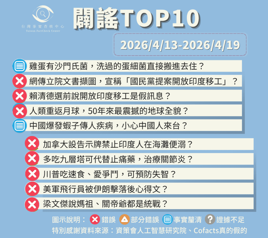 健康 研究揭示水生動物病毒CMNV可能傳染給人、導致眼疾,但目前僅中國有人類病例,尚無人傳人證據 發佈日期: 2026-04-18 政治與政策 誰開放印度移工? 政府簽訂MOU且經立院跨黨派審查通過 政治與政策 賴清德選前否認開放印度移工、選後政策轉彎? 還原政見會談話脈絡 研究揭示水生動物病毒CMNV可能傳染給人、導致眼疾,但目前僅中國有人類病例,尚無人傳人證據發佈日期: 2026-04-18賴清德選前否認開放印度移工、選後政策轉彎? 還原政見會談話脈絡發佈日期: 2026-04-17誰開放印度移工? 政府簽訂MOU且經立院跨黨派審查通過發佈日期: 2026-04-17 更多查核報告 編輯推薦 每週謠言TOP10【2026/4/6-2026/4/12】闢謠TOP10發佈日期: 2026-04-13議題觀察室TPASS、運動部為何喊沒錢?梳理《預算法》54條法理攻防發佈日期: 2026-04-17議題觀察室發生山難不能只靠傳 LINE 定位!登山客必修的「救命座標課」發佈日期: 2026-04-10Podcast節目AI有無著作權不重要,「人」如何用AI才是重點!發佈日期: 2026-04-08 每週謠言TOP10【2026/4/6-2026/4/12】闢謠TOP10發佈日期: 2026-04-13 議題觀察室TPASS、運動部為何喊沒錢?梳理《預算法》54條法理攻防議題觀察室發生山難不能只靠傳 LINE 定位!登山客必修的「救命座標課」Podcast節目AI有無著作權不重要,「人」如何用AI才是重點! 重點專區 1231231231231231231231231231231231231231231 3211231231231123123123123123123123231231231231231 最新消息及公告 公告與新聞稿【北中南讀者見面會】揭開查核中心神秘面紗 開箱事實查核公告與新聞稿年前漢他病毒傳言流傳 台灣查核聯盟啟動首次聯合演習公告與新聞稿再獲國際認證 查核中心以多元創新對抗資訊挑戰公告與新聞稿深入拆解跨國詐騙產業鏈 查核中心獲消費者權益報導獎優勝公告與新聞稿網路謠言影響疫苗接種意願 查核中心攜手3大醫學會破除假訊息公告與新聞稿台灣事實查核組織結盟 聯手對抗緊急事件下的資訊亂流 最新消息及公告 公告與新聞稿【北中南讀者見面會】揭開查核中心神秘面紗 開箱事實查核發佈日期: 2026-01-29公告與新聞稿年前漢他病毒傳言流傳 台灣查核聯盟啟動首次聯合演習發佈日期: 2026-02-24公告與新聞稿再獲國際認證 查核中心以多元創新對抗資訊挑戰發佈日期: 2025-11-13公告與新聞稿深入拆解跨國詐騙產業鏈 查核中心獲消費者權益報導獎優勝發佈日期: 2025-11-19公告與新聞稿網路謠言影響疫苗接種意願 查核中心攜手3大醫學會破除假訊息發佈日期: 2025-09-10公告與新聞稿台灣事實查核組織結盟 聯手對抗緊急事件下的資訊亂流發佈日期: 2025-05-28 熱門文章 Threads、FB出現「農產品改良便宜賣」詐騙,多處農改所被冠名冒用 「爸媽一輩子顧酪梨……」,提防社群「農產滯銷」詐騙 網路流傳片面資訊,誤導雇主需照護懷孕移工 九層塔不能取代止痛藥,也不能治療關節炎 網路社群流傳虛構的F-15飛行員逃生經歷 網路影片造謠4月電價大漲。經濟部已宣布今年4月至9月電價凍漲 訂閱TFC電子報 * 必填欄位/Required 你的電子郵件/ Your Email * 我們怎麼稱呼你/ Your name 選擇你想訂閱的電子報/ Sign up to 中文雙週報/ Biweekly Newsletter (in Chinese) TFC Disinfo Detector (in English)