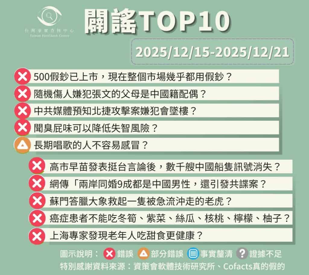 政治與政策 網傳過時新聞擷圖誤導隨機傷人案凶嫌為中國籍 發佈日期: 2025-12-23 政治與政策 網傳隨機傷人嫌犯「資金來自特定政黨、臉書按讚特定媒體」說法不實 國際 中國媒體並未預知隨機傷人嫌犯張文墜樓,網傳截圖是微博發文的原始時間,後續經過兩次編輯 網傳過時新聞擷圖誤導隨機傷人案凶嫌為中國籍發佈日期: 2025-12-23網傳隨機傷人嫌犯「資金來自特定政黨、臉書按讚特定媒體」說法不實發佈日期: 2025-12-23中國媒體並未預知隨機傷人嫌犯張文墜樓,網傳截圖是微博發文的原始時間,後續經過兩次編輯發佈日期: 2025-12-22 更多查核報告 編輯推薦 每週謠言TOP10【2025/12/15-2025/12/21】闢謠TOP10發佈日期: 2025-12-22議題觀察室台北隨機攻擊案 專家籲謹慎討論、避免過度曝光與模仿風險發佈日期: 2025-12-20研究與動態X平台揭露帳號位置新功能 定位可能不準惹議發佈日期: 2025-12-05Podcast節目2027武統危機?林飛帆:《全民安全指引》是提高社會韌性的「不戰爭手冊」發佈日期: 2025-12-09 每週謠言TOP10【2025/12/15-2025/12/21】闢謠TOP10發佈日期: 2025-12-22 議題觀察室台北隨機攻擊案 專家籲謹慎討論、避免過度曝光與模仿風險研究與動態X平台揭露帳號位置新功能 定位可能不準惹議Podcast節目2027武統危機?林飛帆:《全民安全指引》是提高社會韌性的「不戰爭手冊」 重點專區 1231231231231231231231231231231231231231231 3211231231231123123123123123123123231231231231231 最新消息及公告 公告與新聞稿再獲國際認證 查核中心以多元創新對抗資訊挑戰公告與新聞稿深入拆解跨國詐騙產業鏈 查核中心獲消費者權益報導獎優勝公告與新聞稿以查核專業投入詐騙防治:台灣事實查核中心參與數發部網路詐騙通報網公告與新聞稿網路謠言影響疫苗接種意願 查核中心攜手3大醫學會破除假訊息公告與新聞稿台灣事實查核中心如何與Meta合作?常見問題一次答公告與新聞稿台灣事實查核組織結盟 聯手對抗緊急事件下的資訊亂流 最新消息及公告 公告與新聞稿再獲國際認證 查核中心以多元創新對抗資訊挑戰發佈日期: 2025-11-13公告與新聞稿深入拆解跨國詐騙產業鏈 查核中心獲消費者權益報導獎優勝發佈日期: 2025-11-19公告與新聞稿以查核專業投入詐騙防治:台灣事實查核中心參與數發部網路詐騙通報網發佈日期: 2025-11-12公告與新聞稿網路謠言影響疫苗接種意願 查核中心攜手3大醫學會破除假訊息發佈日期: 2025-09-10公告與新聞稿台灣事實查核中心如何與Meta合作?常見問題一次答發佈日期: 2025-01-20公告與新聞稿台灣事實查核組織結盟 聯手對抗緊急事件下的資訊亂流發佈日期: 2025-05-28 熱門文章 「方陣快砲」上公路? AI迷因圖變身網路謠言 1.25兆國防特別預算為台美軍售建案,計畫分8年執行。條例草案尚未進入實質審查 日首相高市早苗在國會表示日本理解並尊重中國立場,並非承認「台灣屬中」說法 網傳「台南垃圾場火災有石棉瓦」是缺乏證據的說法 網傳「謝長廷以珠寶賄賂高市高苗」源於不可信的海外匿名論壇 芭樂營養素有助延緩醣類吸收 帶皮吃可以攝取更多營養 訂閱TFC電子報 * 必填欄位/Required 你的電子郵件/ Your Email * 我們怎麼稱呼你/ Your name 選擇你想訂閱的電子報/ Sign up to 中文雙週報/ Biweekly Newsletter (in Chinese) TFC Disinfo Detector (in English)