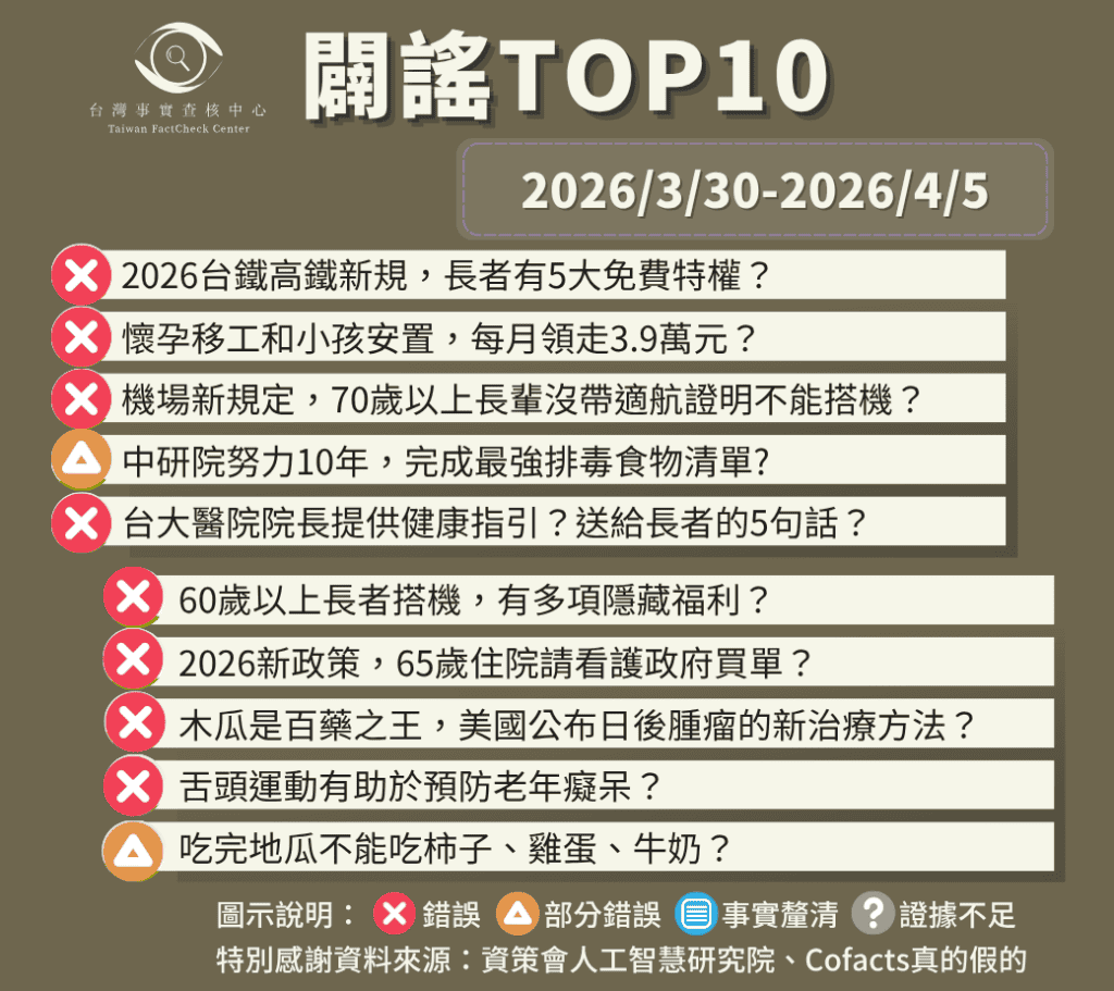 生活 網傳「2026年4月起長輩搭機須附適航證明」為虛構訊息,航空公司無此規定 發佈日期: 2026-04-07 生活 YouTube多個頻道生成AI影片,誤導60歲以上長者有隱藏搭機福利 生活 高鐵台鐵並無「長者5大免費特權」,AI生成影片虛構福利 YouTube多個頻道生成AI影片,誤導60歲以上長者有隱藏搭機福利發佈日期: 2026-04-07網傳「2026年4月起長輩搭機須附適航證明」為虛構訊息,航空公司無此規定發佈日期: 2026-04-07高鐵台鐵並無「長者5大免費特權」,AI生成影片虛構福利發佈日期: 2026-04-02 更多查核報告 編輯推薦 每週謠言TOP10【2026/3/30-2026/4/5】闢謠TOP10發佈日期: 2026-04-07議題觀察室伊朗戰火下的台灣資訊亂流與中共政治宣傳發佈日期: 2026-03-31名家專欄接種新冠疫苗會致癌嗎?解讀韓國研究:看見發生率背後的意義發佈日期: 2026-02-26Podcast節目AI時代不想努力?侯文詠:躺平是人生最貴的隱藏成本發佈日期: 2026-04-02 每週謠言TOP10【2026/3/30-2026/4/5】闢謠TOP10發佈日期: 2026-04-07 議題觀察室伊朗戰火下的台灣資訊亂流與中共政治宣傳名家專欄接種新冠疫苗會致癌嗎?解讀韓國研究:看見發生率背後的意義Podcast節目AI時代不想努力?侯文詠:躺平是人生最貴的隱藏成本 重點專區 1231231231231231231231231231231231231231231 3211231231231123123123123123123123231231231231231 最新消息及公告 公告與新聞稿【徵才】台灣事實查核中心誠徵專案執行(Project Assistant)公告與新聞稿【北中南讀者見面會】揭開查核中心神秘面紗 開箱事實查核公告與新聞稿年前漢他病毒傳言流傳 台灣查核聯盟啟動首次聯合演習公告與新聞稿再獲國際認證 查核中心以多元創新對抗資訊挑戰公告與新聞稿深入拆解跨國詐騙產業鏈 查核中心獲消費者權益報導獎優勝公告與新聞稿網路謠言影響疫苗接種意願 查核中心攜手3大醫學會破除假訊息 最新消息及公告 公告與新聞稿【徵才】台灣事實查核中心誠徵專案執行(Project Assistant)發佈日期: 2026-03-30公告與新聞稿【北中南讀者見面會】揭開查核中心神秘面紗 開箱事實查核發佈日期: 2026-01-29公告與新聞稿年前漢他病毒傳言流傳 台灣查核聯盟啟動首次聯合演習發佈日期: 2026-02-24公告與新聞稿再獲國際認證 查核中心以多元創新對抗資訊挑戰發佈日期: 2025-11-13公告與新聞稿深入拆解跨國詐騙產業鏈 查核中心獲消費者權益報導獎優勝發佈日期: 2025-11-19公告與新聞稿網路謠言影響疫苗接種意願 查核中心攜手3大醫學會破除假訊息發佈日期: 2025-09-10 熱門文章 小心提防「白沙屯媽祖結緣品贈送」詐騙訊息 中國利用台灣旅行團宣傳 「協助滯留中東70台胞」與事實不符 網傳「懷孕移工可領高額補助、政府養小孩到6歲」為不實訊息 網傳「國發會與韋弗資本合作」為假冒名人、利用AI變造影像的投資詐騙 網傳「3月中後無LNG船靠台」說法錯誤。根據開源資料,3月中後持續有LNG船靠港 網傳「高鐵、臺鐵敬老票隱藏買法」是AI生成,夾雜錯誤資訊 訂閱TFC電子報 * 必填欄位/Required 你的電子郵件/ Your Email * 我們怎麼稱呼你/ Your name 選擇你想訂閱的電子報/ Sign up to 中文雙週報/ Biweekly Newsletter (in Chinese) TFC Disinfo Detector (in English)