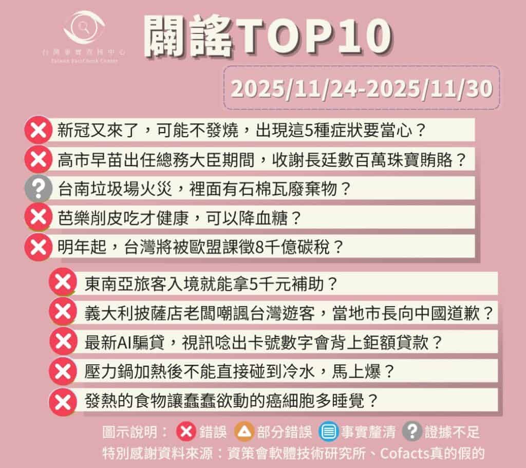 政治與政策 桃園蘆竹工廠火災遭網路誤傳為演習砲擊 發佈日期: 2025-12-04 健康 查無網傳「老人吃甜食更健康」研究,醫學證實吃糖弊大於利 國際 網傳影片為2024年日本歌手城南海演出畫面,不是高市早苗 桃園蘆竹工廠火災遭網路誤傳為演習砲擊發佈日期: 2025-12-04查無網傳「老人吃甜食更健康」研究,醫學證實吃糖弊大於利發佈日期: 2025-12-04網傳影片為2024年日本歌手城南海演出畫面,不是高市早苗發佈日期: 2025-12-05 更多查核報告 編輯推薦 每週謠言TOP10【2025/11/24-2025/11/30】闢謠TOP10發佈日期: 2025-12-01研究與動態X平台揭露帳號位置新功能 定位可能不準惹議發佈日期: 2025-12-05議題觀察室從數字到戰力:國防預算突破GDP 3%的意義與未竟挑戰發佈日期: 2025-11-18Podcast節目陳瑞杰:災難戰爭時,最大原則是「先顧好自己」發佈日期: 2025-11-24 每週謠言TOP10【2025/11/24-2025/11/30】闢謠TOP10發佈日期: 2025-12-01 研究與動態X平台揭露帳號位置新功能 定位可能不準惹議議題觀察室從數字到戰力:國防預算突破GDP 3%的意義與未竟挑戰Podcast節目陳瑞杰:災難戰爭時,最大原則是「先顧好自己」 重點專區 1231231231231231231231231231231231231231231 3211231231231123123123123123123123231231231231231 最新消息及公告 公告與新聞稿再獲國際認證 查核中心以多元創新對抗資訊挑戰公告與新聞稿深入拆解跨國詐騙產業鏈 查核中心獲消費者權益報導獎優勝公告與新聞稿以查核專業投入詐騙防治:台灣事實查核中心參與數發部網路詐騙通報網公告與新聞稿網路謠言影響疫苗接種意願 查核中心攜手3大醫學會破除假訊息公告與新聞稿台灣事實查核中心如何與Meta合作?常見問題一次答公告與新聞稿台灣事實查核組織結盟 聯手對抗緊急事件下的資訊亂流 最新消息及公告 公告與新聞稿再獲國際認證 查核中心以多元創新對抗資訊挑戰發佈日期: 2025-11-13公告與新聞稿深入拆解跨國詐騙產業鏈 查核中心獲消費者權益報導獎優勝發佈日期: 2025-11-19公告與新聞稿以查核專業投入詐騙防治:台灣事實查核中心參與數發部網路詐騙通報網發佈日期: 2025-11-12公告與新聞稿網路謠言影響疫苗接種意願 查核中心攜手3大醫學會破除假訊息發佈日期: 2025-09-10公告與新聞稿台灣事實查核中心如何與Meta合作?常見問題一次答發佈日期: 2025-01-20公告與新聞稿台灣事實查核組織結盟 聯手對抗緊急事件下的資訊亂流發佈日期: 2025-05-28 熱門文章 「方陣快砲」上公路? AI迷因圖變身網路謠言 1.25兆國防特別預算為台美軍售建案,計畫分8年執行。條例草案尚未進入實質審查 日首相高市早苗在國會表示日本理解並尊重中國立場,並非承認「台灣屬中」說法 網傳「台南垃圾場火災有石棉瓦」是缺乏證據的說法 網傳「謝長廷以珠寶賄賂高市高苗」源於不可信的海外匿名論壇 芭樂營養素有助延緩醣類吸收 帶皮吃可以攝取更多營養 訂閱TFC電子報 * 必填欄位/Required 你的電子郵件/ Your Email * 我們怎麼稱呼你/ Your name 選擇你想訂閱的電子報/ Sign up to 中文雙週報/ Biweekly Newsletter (in Chinese) TFC Disinfo Detector (in English)