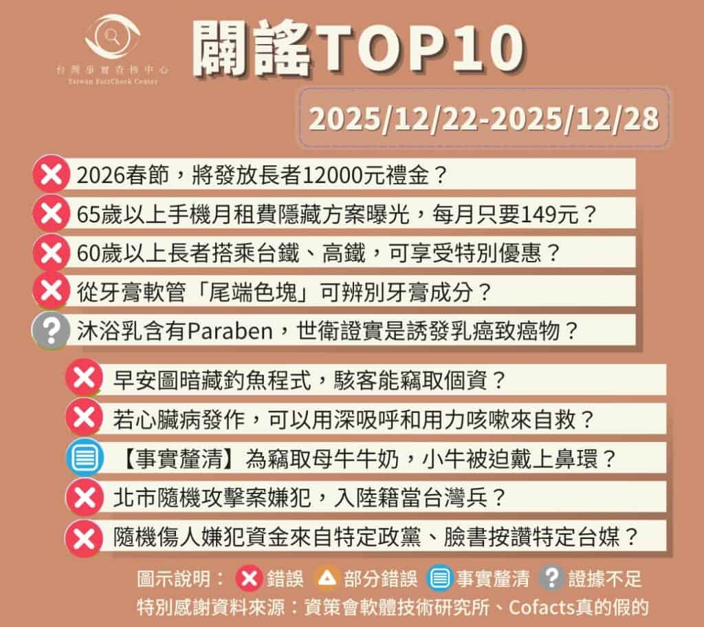 科技資安 近期又有詐騙假冒遠通電收網站,收到信件、簡訊先確認 發佈日期: 2025-12-29 生活 台灣牧場小牛出生一至兩天即於母牛分離,網傳「給小牛掛鼻環阻止喝奶」不是台灣現況 生活 內容農場網站將新竹新豐攻擊案錯稱為隨機攻擊 近期又有詐騙假冒遠通電收網站,收到信件、簡訊先確認發佈日期: 2025-12-29台灣牧場小牛出生一至兩天即於母牛分離,網傳「給小牛掛鼻環阻止喝奶」不是台灣現況發佈日期: 2025-12-29網傳「人造海參」影片是挪用仿真果實甜點製作畫面發佈日期: 2025-12-29 更多查核報告 編輯推薦 每週謠言TOP10【2025/12/22-2025/12/28】闢謠TOP10發佈日期: 2025-12-29議題觀察室【台北襲擊事件】陰謀論流傳 凸顯日益升溫的政治對立氛圍發佈日期: 2025-12-26議題觀察室台北隨機攻擊案 專家籲謹慎討論、避免過度曝光與模仿風險發佈日期: 2025-12-20Podcast節目TikTok親自回應:台灣個資會「送中」嗎?發佈日期: 2025-12-23 每週謠言TOP10【2025/12/22-2025/12/28】闢謠TOP10發佈日期: 2025-12-29 議題觀察室【台北襲擊事件】陰謀論流傳 凸顯日益升溫的政治對立氛圍議題觀察室台北隨機攻擊案 專家籲謹慎討論、避免過度曝光與模仿風險Podcast節目TikTok親自回應:台灣個資會「送中」嗎? 重點專區 1231231231231231231231231231231231231231231 3211231231231123123123123123123123231231231231231 最新消息及公告 公告與新聞稿再獲國際認證 查核中心以多元創新對抗資訊挑戰公告與新聞稿深入拆解跨國詐騙產業鏈 查核中心獲消費者權益報導獎優勝公告與新聞稿以查核專業投入詐騙防治:台灣事實查核中心參與數發部網路詐騙通報網公告與新聞稿網路謠言影響疫苗接種意願 查核中心攜手3大醫學會破除假訊息公告與新聞稿台灣事實查核中心如何與Meta合作?常見問題一次答公告與新聞稿台灣事實查核組織結盟 聯手對抗緊急事件下的資訊亂流 最新消息及公告 公告與新聞稿再獲國際認證 查核中心以多元創新對抗資訊挑戰發佈日期: 2025-11-13公告與新聞稿深入拆解跨國詐騙產業鏈 查核中心獲消費者權益報導獎優勝發佈日期: 2025-11-19公告與新聞稿以查核專業投入詐騙防治:台灣事實查核中心參與數發部網路詐騙通報網發佈日期: 2025-11-12公告與新聞稿網路謠言影響疫苗接種意願 查核中心攜手3大醫學會破除假訊息發佈日期: 2025-09-10公告與新聞稿台灣事實查核中心如何與Meta合作?常見問題一次答發佈日期: 2025-01-20公告與新聞稿台灣事實查核組織結盟 聯手對抗緊急事件下的資訊亂流發佈日期: 2025-05-28 熱門文章 X平台揭露帳號位置新功能 定位可能不準惹議 隨機傷人凶嫌張文的父母並非中國籍配偶 網路流傳虛構的兩岸同婚數據與共諜案例 中國2021年起即限制船隻AIS資料存取 與高市早苗言論無關 中國媒體並未預知隨機傷人嫌犯張文墜樓,網傳截圖是微博發文的原始時間,後續經過兩次編輯 媒體報導「聞臭屁可以預防阿茲海默症」是誇大解讀研究結果 訂閱TFC電子報 * 必填欄位/Required 你的電子郵件/ Your Email * 我們怎麼稱呼你/ Your name 選擇你想訂閱的電子報/ Sign up to 中文雙週報/ Biweekly Newsletter (in Chinese) TFC Disinfo Detector (in English)
