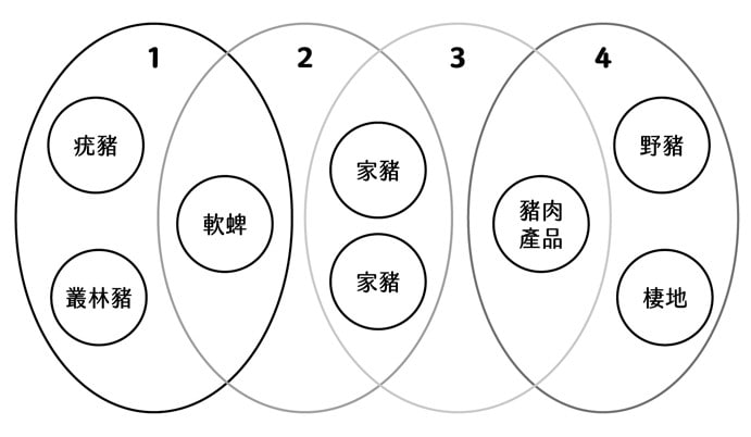 科學月刊〈非洲豬瘟席捲全球,台灣如何險中求生?〉指出,非洲豬瘟病毒藉由直接接觸來感染豬隻,主要的保毒宿主是家豬或野豬,但亦可經由軟蜱(soft tick)作為媒介傳播,傳染到家豬可能是偶然或長期接觸的結果。傳播的循環模式,主要可分成森林、軟蜱-家豬、家豬-家豬及野豬-棲地4種循環。