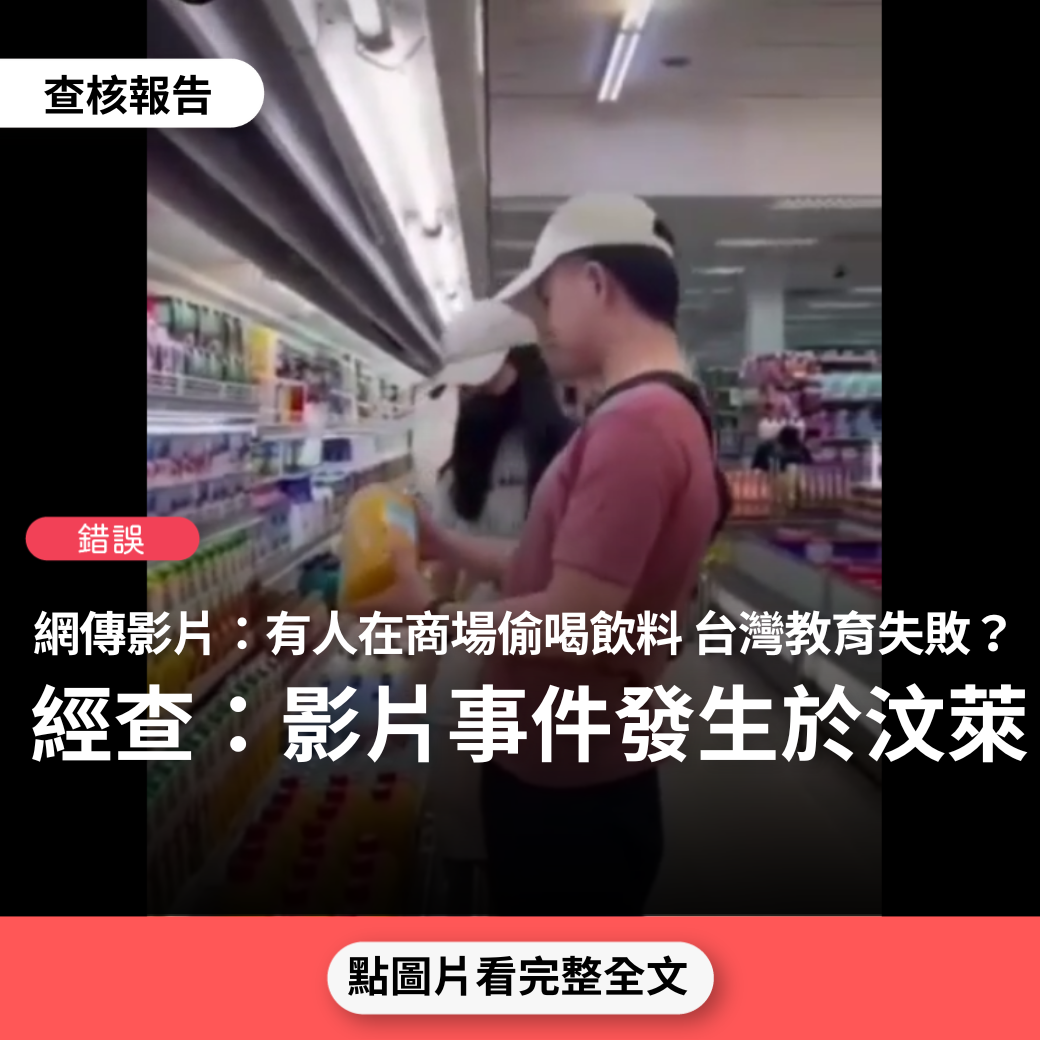 (一)查核中心檢視網傳影片,影片長度約31秒,內容可大致分為兩個段落。第一段落(第0秒至第17秒)為兩名民眾(一男一女),在賣場的冷飲櫃前,打開某罐飲料就口直接飲用後又放回架上並離開。從第18秒開始則是前一段影片的女性民眾和另一名女性,同樣在冷飲櫃前直接打開某一瓶飲料飲用,隨後把開罐的飲料放回,再拿取另外兩瓶飲料交給另一名女性。