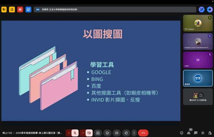 圖說:線上課擷圖,講師說明以圖搜圖的工具如何使用。(台灣事實查核中心提供)