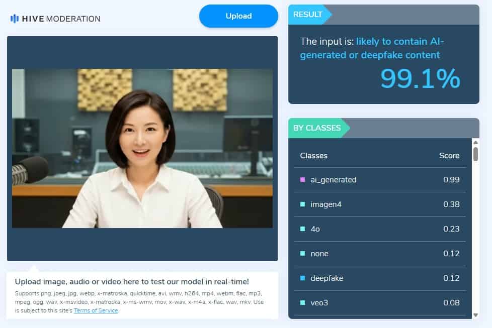 網傳影片資訊欄註明「聲音或影像經過大幅編輯或為數位生成」,使用AI生成影像鑑識軟體「Hive moderation」檢測也發現,網傳影像有極高機率為AI生成,可研判網傳影片為AI生成。