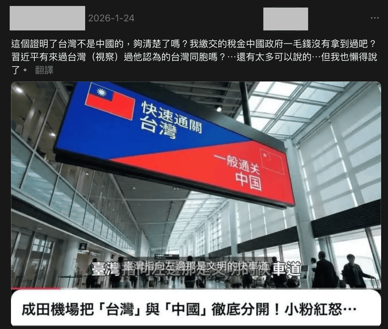 近期社群平台流傳一張顯示「台灣:快速通關」、「中國:一般通關」的指示牌,傳言文字稱「成田機場把『台灣』與『中國』徹底分開」。