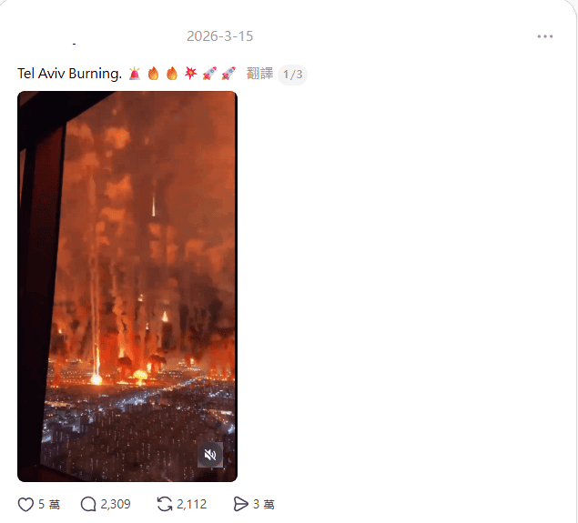 從美國、以色列對伊朗發動攻擊以來,社群平台上經常傳出軍隊交戰或者武器攻擊的影像。社群平台日前流傳一段影像,可見多枚帶著火光的武器持續從空中垂直落下,轟炸一座城市,時間為夜間,影片還附註一行文字”Tel Aviv Burning”(特拉維夫正在燃燒),意指以色列首都特拉維夫遭到猛烈攻擊。