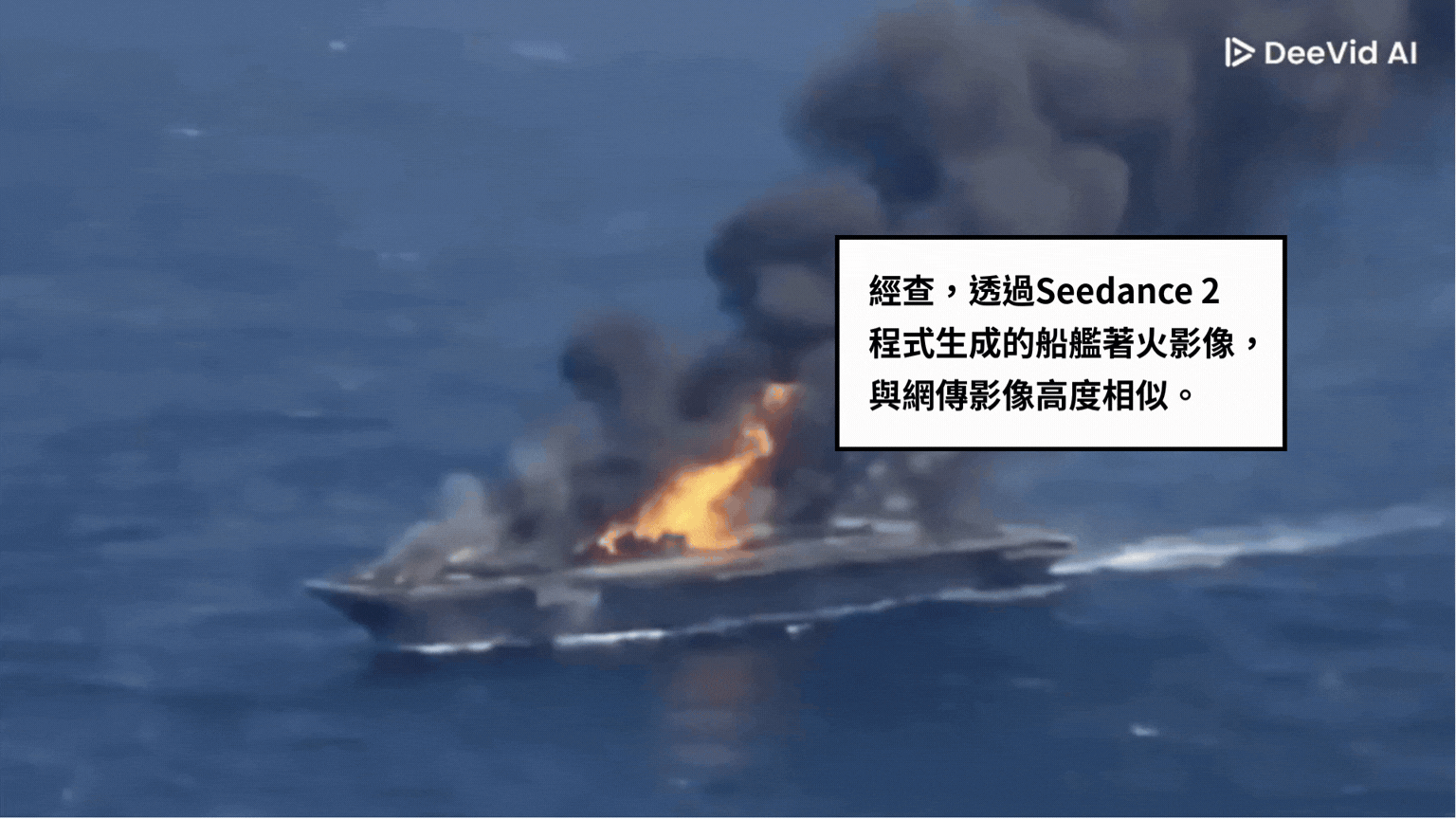 三、AI生成免費檢測工具HIVE Moderation 工具判定該影像極高機率為AI模型 Seedance 2生成,查核記者實際操作同款模型,亦成功還原出視覺風格與細節特徵極度相似的「船艦著火」畫面。