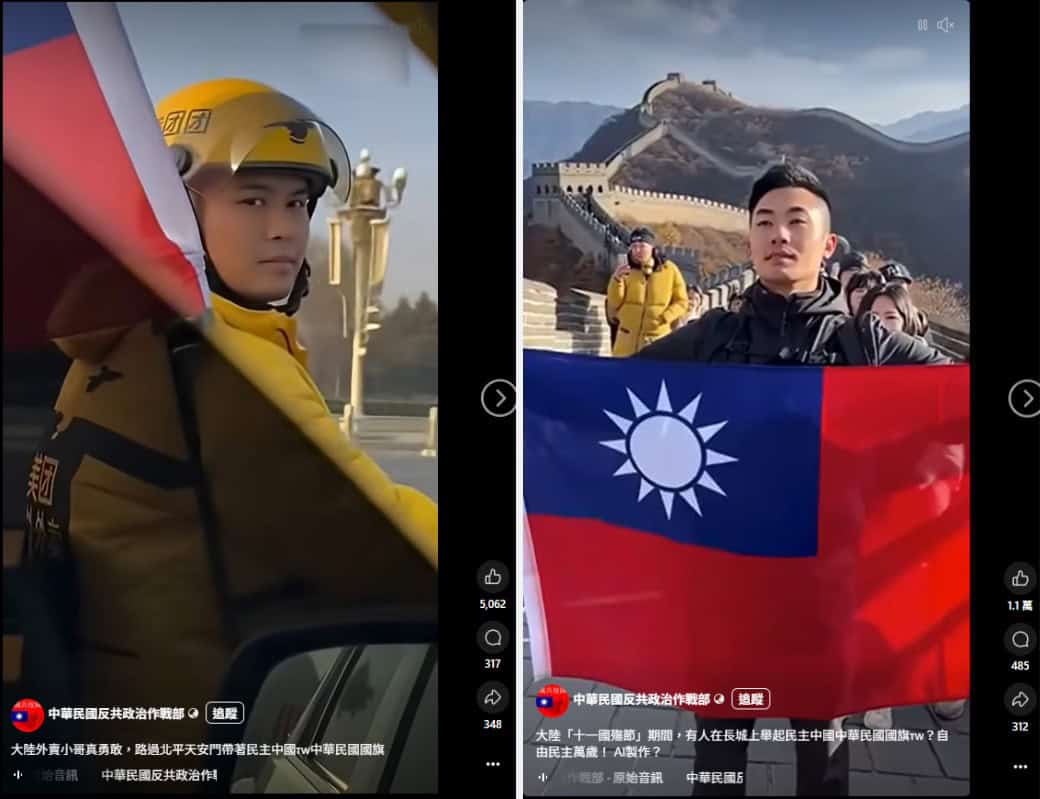 網傳兩段影片,一段為外送員身上掛著「青天白日旗」,騎車經過天安門廣場;另一段為民眾在萬里長城展示中華民國國旗。這兩段影片經查,皆為AI生成。