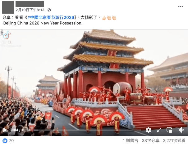 近期社群平台流傳影片,宣稱是2026年北京新年慶典遊行。經查,網傳影片是AI生成影片。