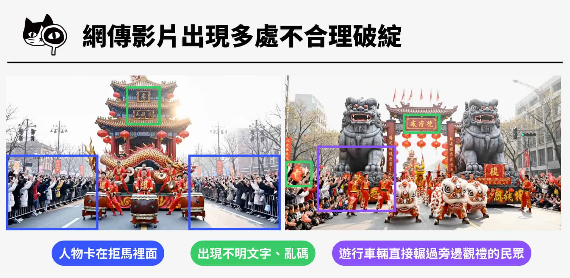 (二)以肉眼觀察網傳影片,可見畫面出現多處瑕疵。例如:0分15秒處,遊行車輛直接輾過旁邊觀禮的民眾;0分27秒處,打鼓表演者腳步完全沒有移動步伐,卻仍以平移的方式持續前進,一旁觀看遊行的民眾其外套也直接穿透拒馬。影片中出現的文字均呈現亂碼。