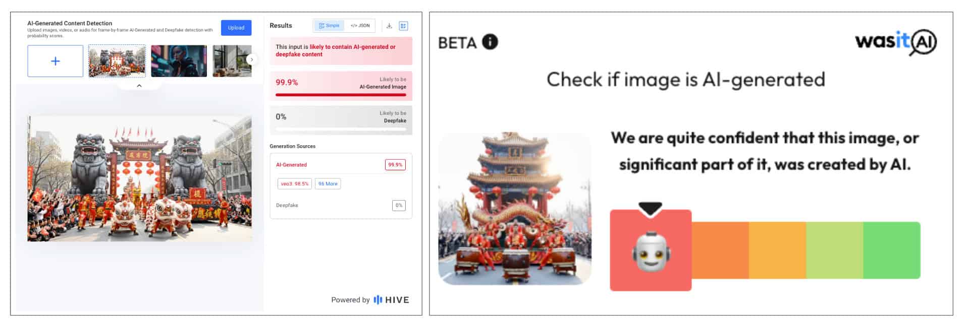 (三)另使用AI工具「Hive moderation」、「was it AI」檢測網傳影片或擷圖,顯示影片有極高機率為AI生成,並非真實影像。