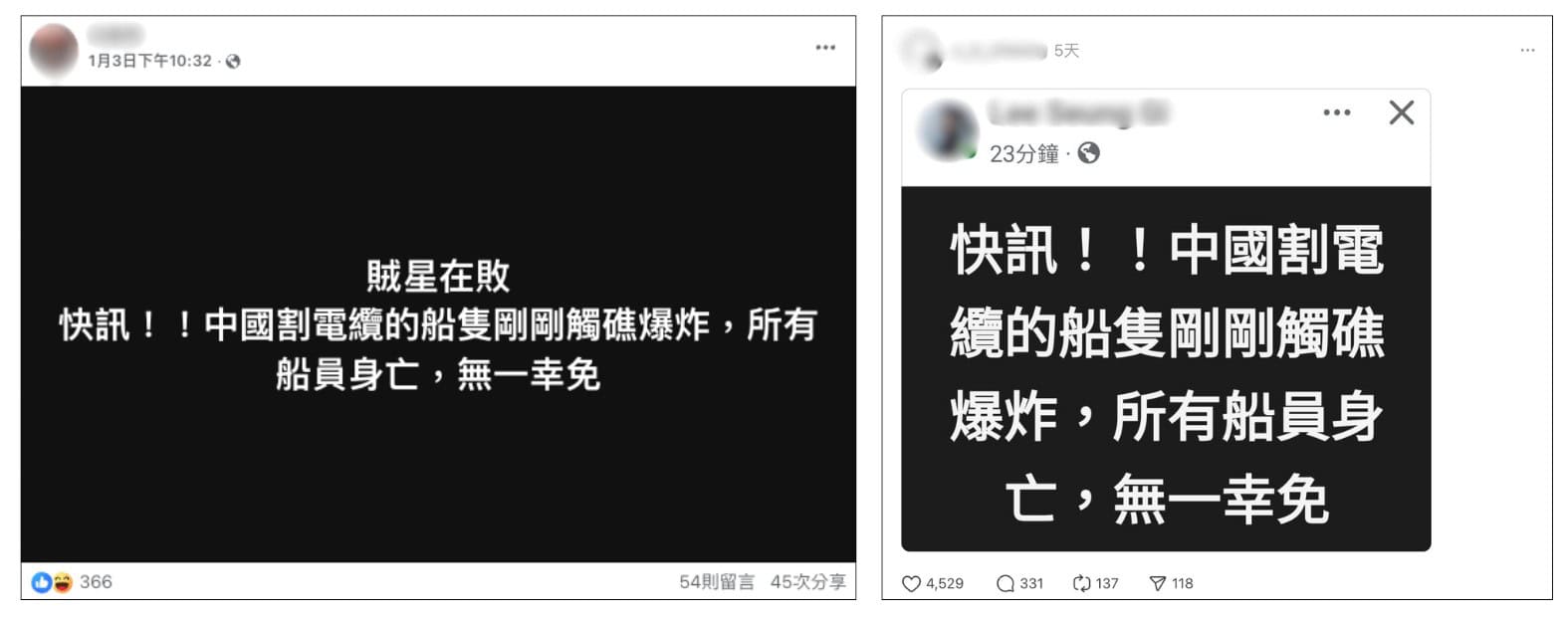 1月3日起,社群平台流傳訊息宣稱「中國割電纜的船隻剛剛觸礁爆炸,所有船員身亡,無一幸免」。