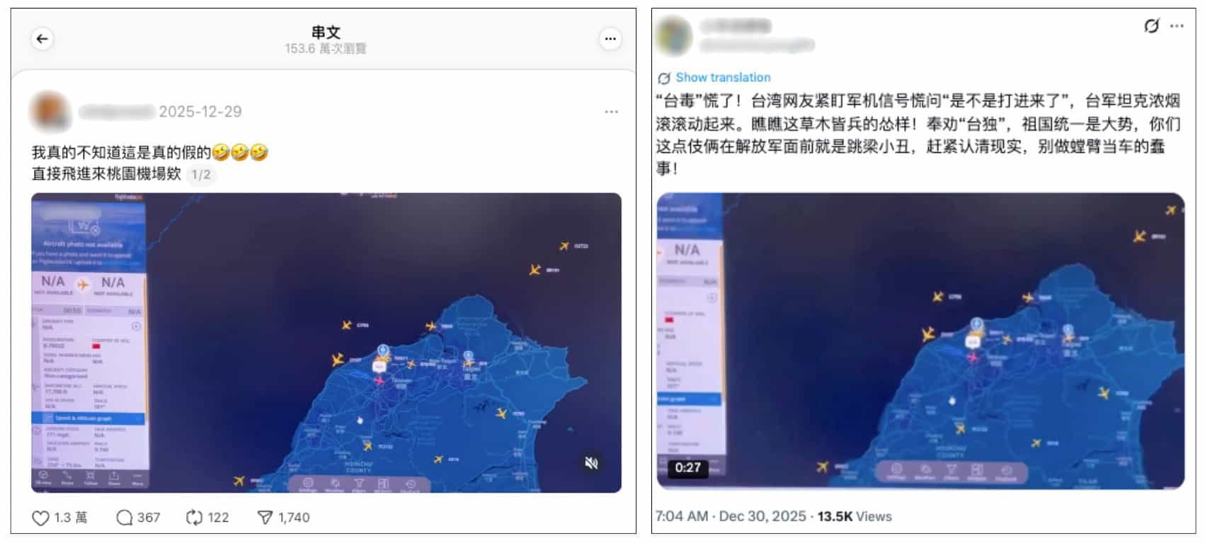解放軍12月29至31日舉行「正義使命-2025」環台軍演,隨後社群平台流傳影片顯示航班追蹤網站FlightRadar24一架編號B-78032的不明中國飛機,飛行於桃園機場周圍上空。經查,共軍演習期間沒有共機飛入台灣領空,網傳畫面與現實情況有落差。