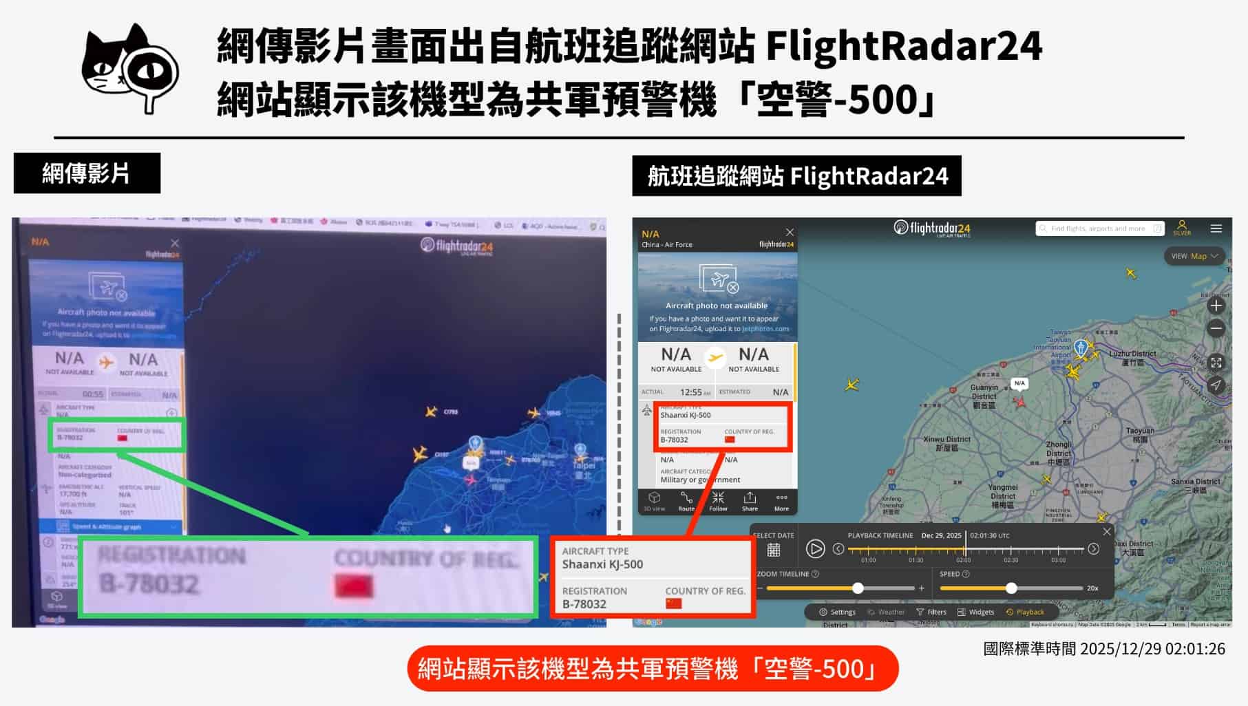查核記者檢索航班追蹤平台FlightRadar24,找到國際標準時間2025年12月29日2時1分26秒處,桃園上空出現飛行器Shaanxi KJ-500,代號為B-78032。
