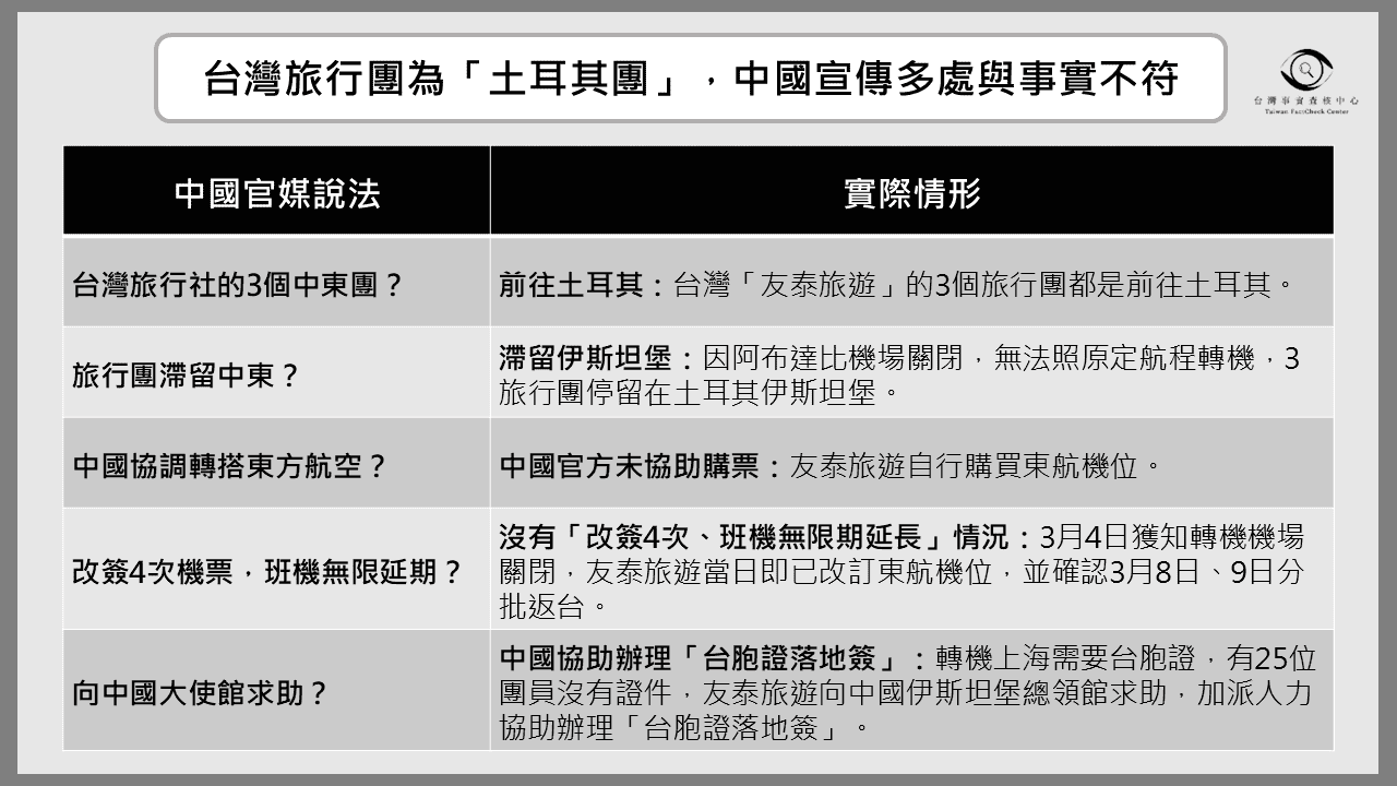 查核記者3月19日訪問當事旅行社「友泰旅遊」,旅行社澄清,他們3個旅行團是前往土耳其旅遊,返台時滯留在伊斯坦堡,當地並無戰爭威脅。此外是由旅行社自行買到返台機位,中國官方並無協助。