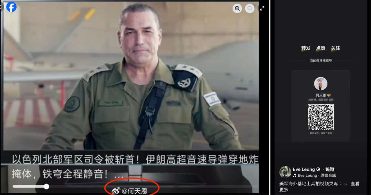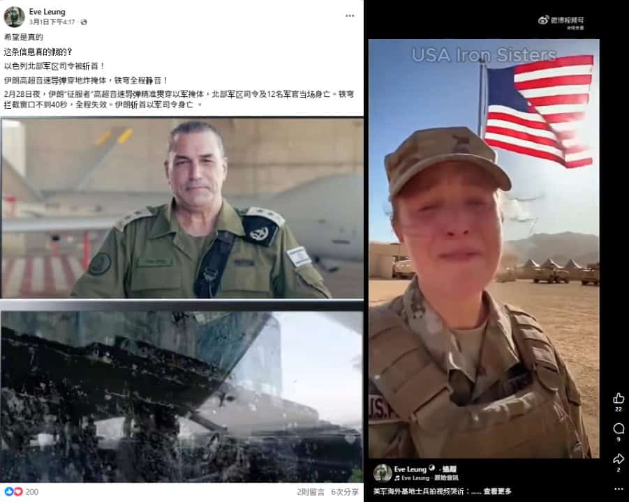 有一則傳言稱「以色列北部軍區司令被斬首」,貼文包括一張以色列將領照片。另一則為短影音,一位身著美軍軍服的年輕女性簡短講了一段話,貼文以中文標註:「美軍海外士兵拍視頻哭訴:『特朗普結束戰爭,讓我們回家。』」