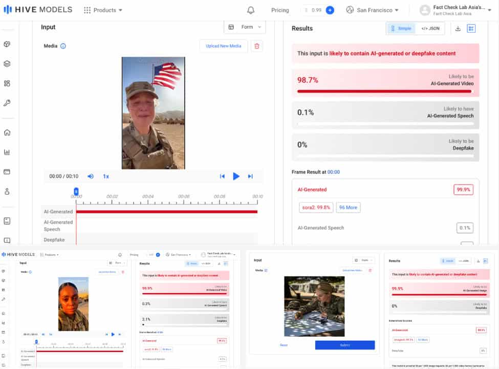 根據HIVE MODELS的偵測結果,包括網傳短影音、另一部類似短影音及一張隨機取得的照片,都被判定有98%以上的機率為AI生成。
