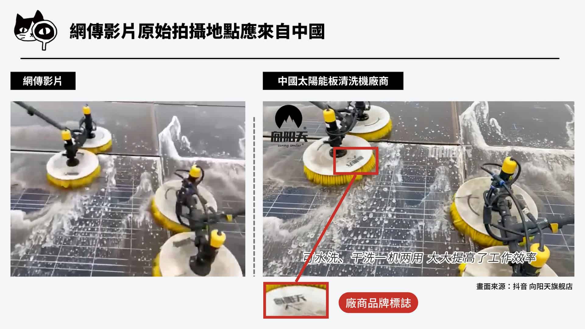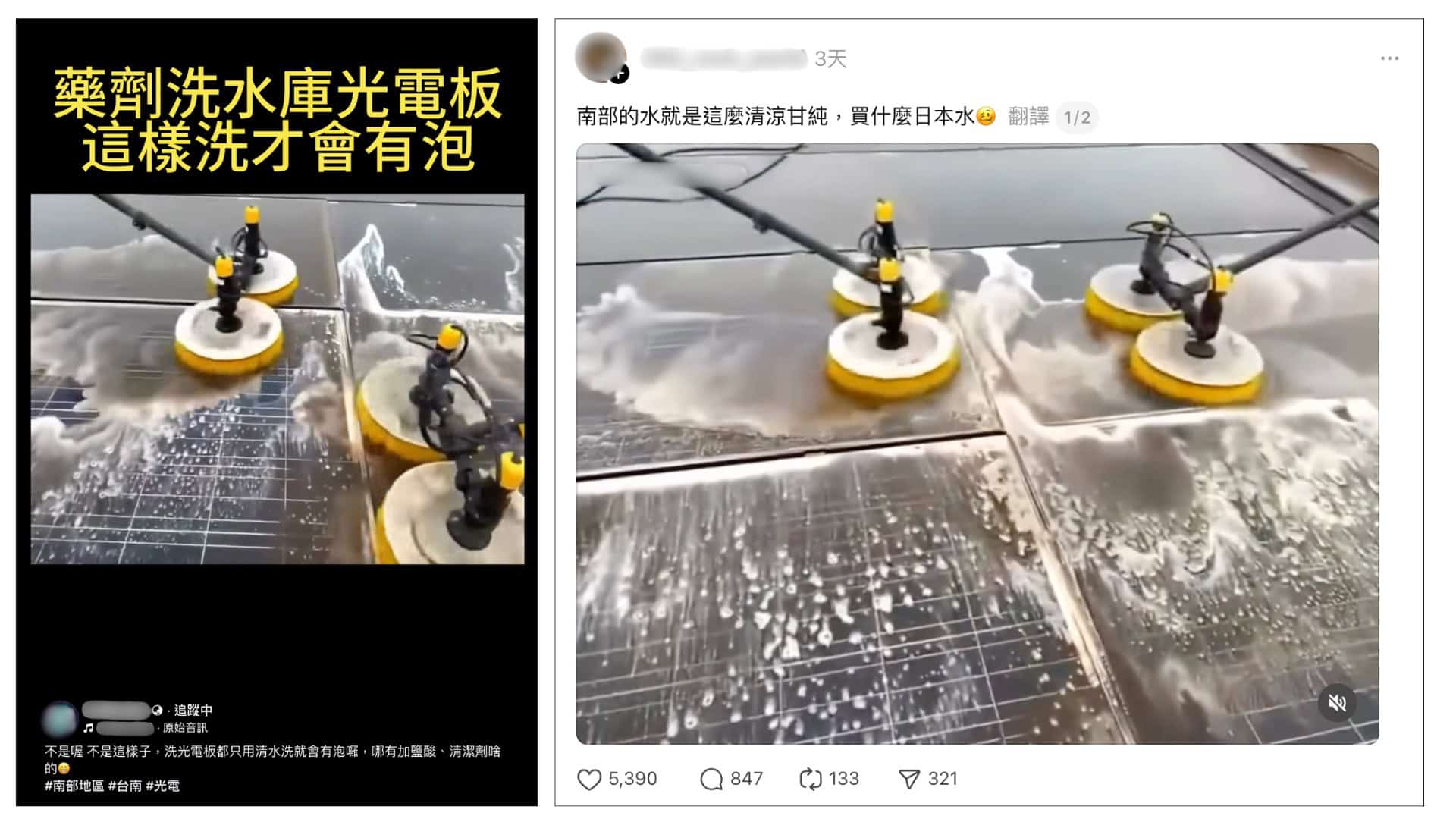 社群平台流傳一段影片,畫面可見以帶有泡沫的機具清洗光電板,搭配文字「洗光電板都只用清水洗就會有泡囉,哪有加鹽酸、清潔劑啥的」一同進行流傳,並標註「台南」字樣。另有網傳版本雖未聲稱地點在台灣,但下方留言多將其與近期烏山頭水庫事件連結討論。