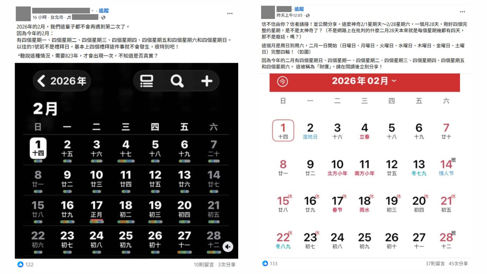 近日網路流傳「2026年2月有完整的4個星期、823年才出現一次」說法;經查證,網傳現象通常每6年發生一次,並非823年才會碰到一次的罕見情形。