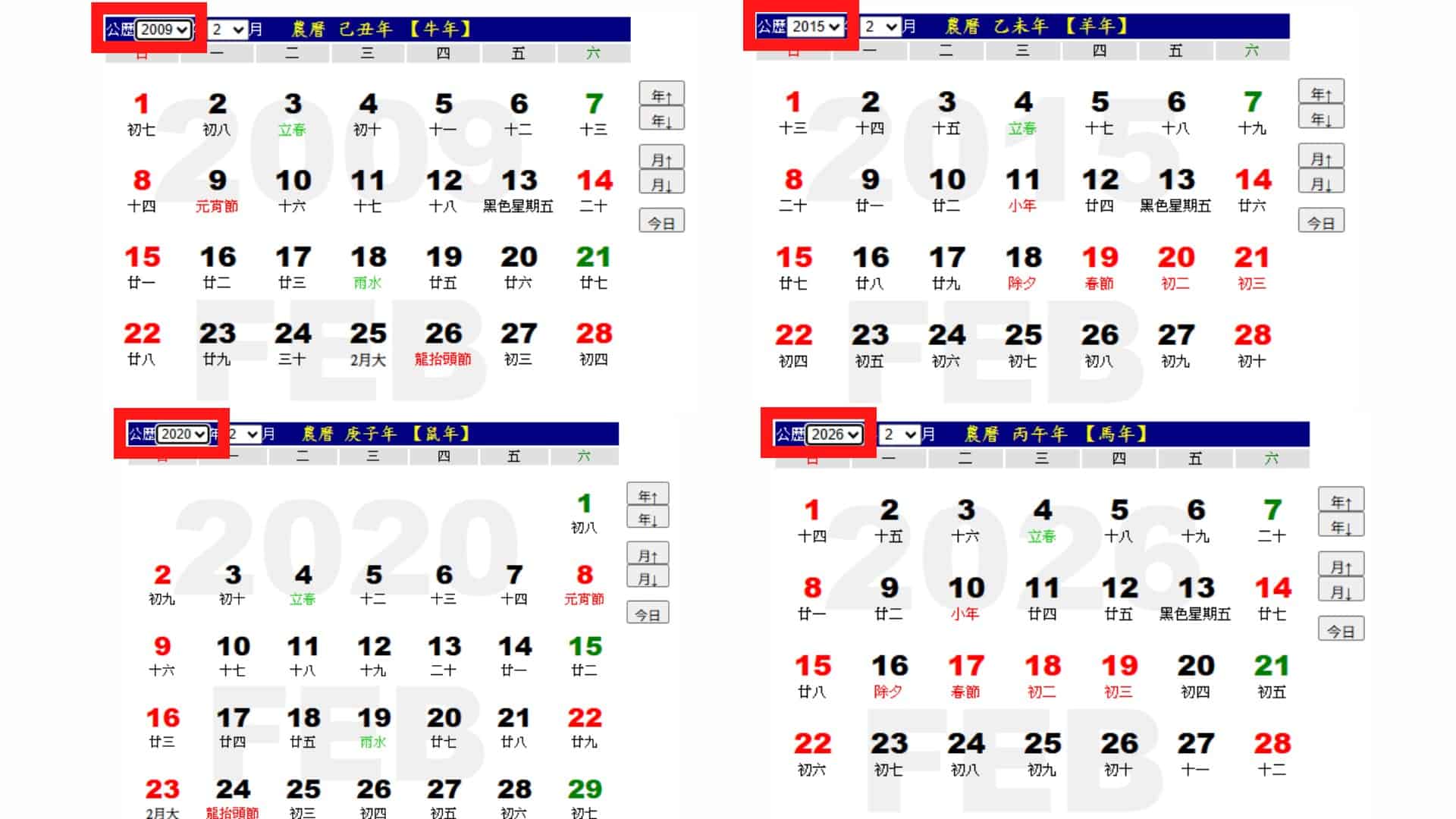 此外,查核中心也實際查詢萬年曆,可見到2009年、2015年、2020年(閏年)及2026年的2月,都有完整的4個星期,且除了閏年外,通常每隔6年就會出現一次傳言描述的情形,也並不罕見。