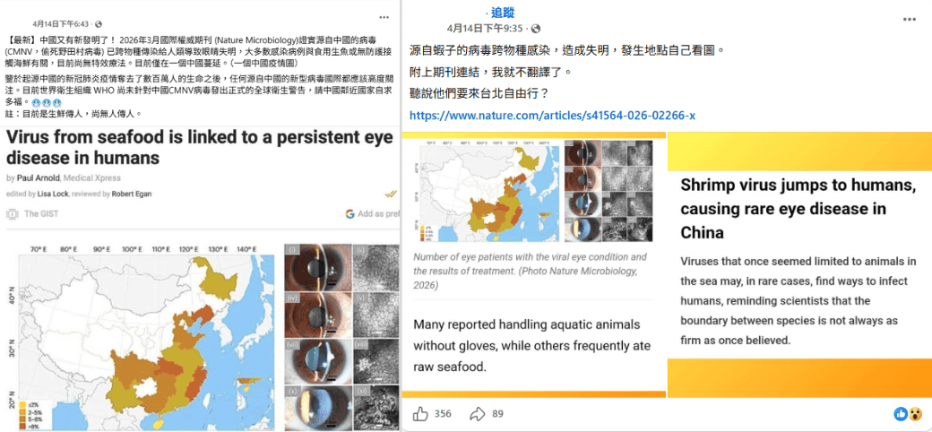 檢視貼文附上的研究資料,發表於2026年4月《自然-微生物學》(Nature Microbiology),研究指出,一種通常感染海洋動物如蝦和魚的病毒,已經感染到人類,導致部分人感染慢性眼疾。近年來,中國患有持續性眼部高壓病毒性前葡萄膜炎(POH-VAU)的病例數量持續增加,原因尚無明確解釋,研究人員懷疑偷死野田村病毒(CMNV)可能是原因。