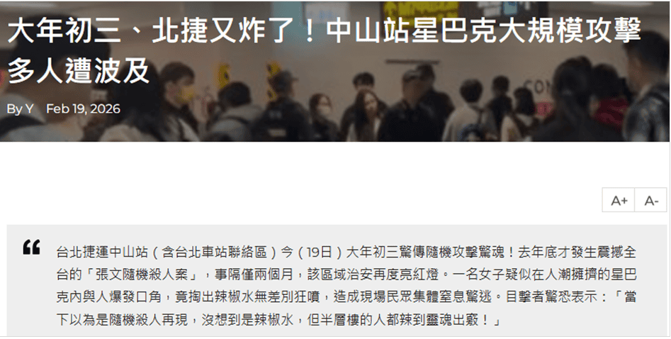 近期多個社群平台流傳訊息、圖卡,聲稱「大年初三北捷又炸了」、「中山站星巴克大規模攻擊、多人遭波及」。經查為內容農場改寫新聞的誤導訊息。