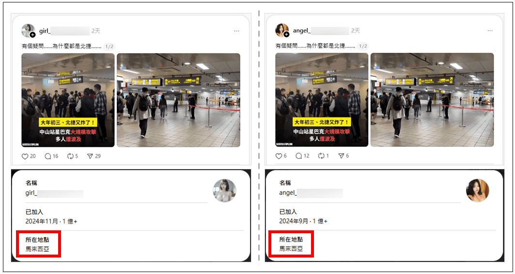 網傳文章、圖卡在2月19日即已出現,隨即在FB、Threads等社群平台分享、流傳。其中Threads至少有7個帳號散播此一訊息,但位置都顯示在馬來西亞,並非台灣。