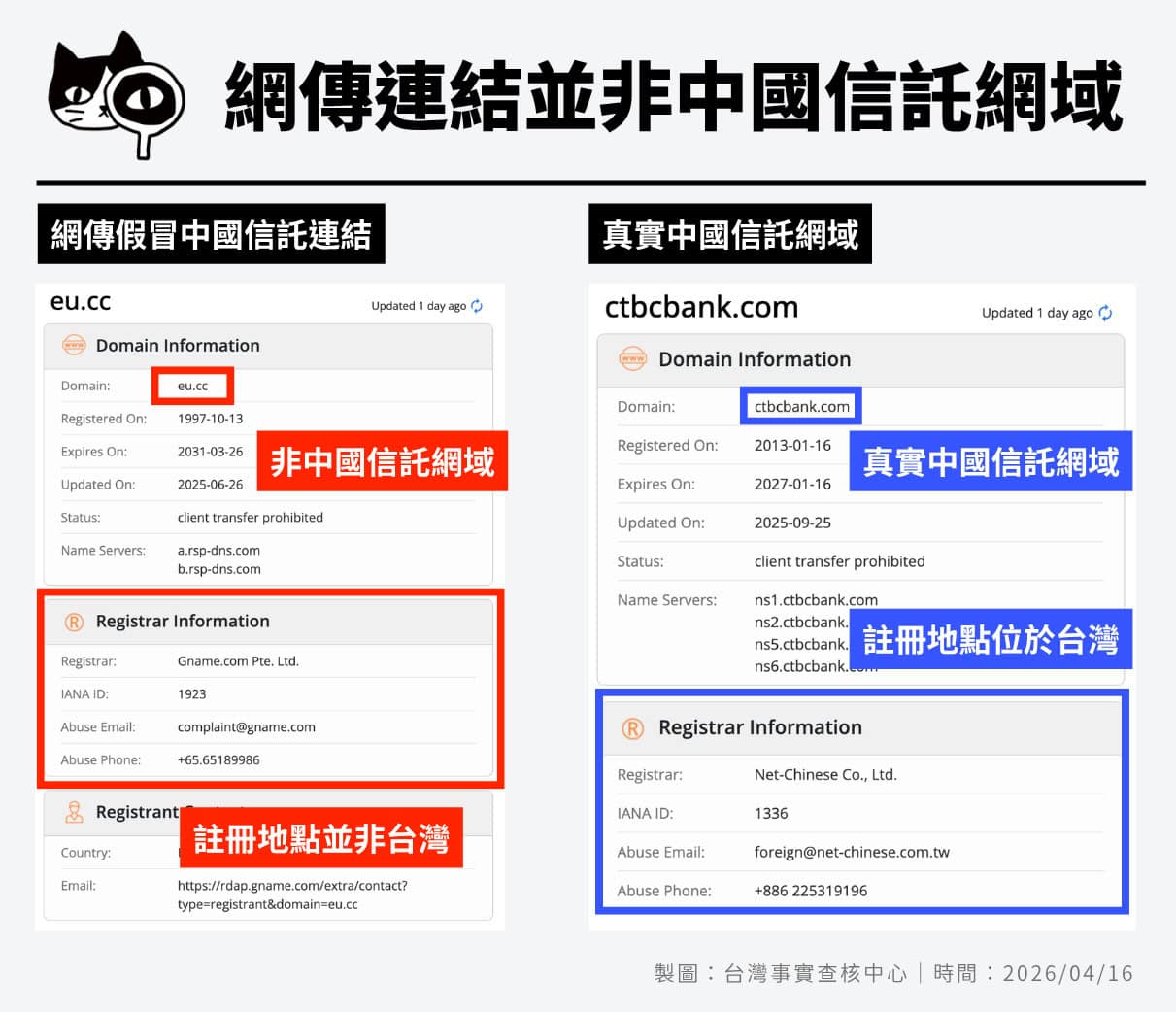 網傳連結並非中國信託網域,該網站的網域註冊地點也不在台灣