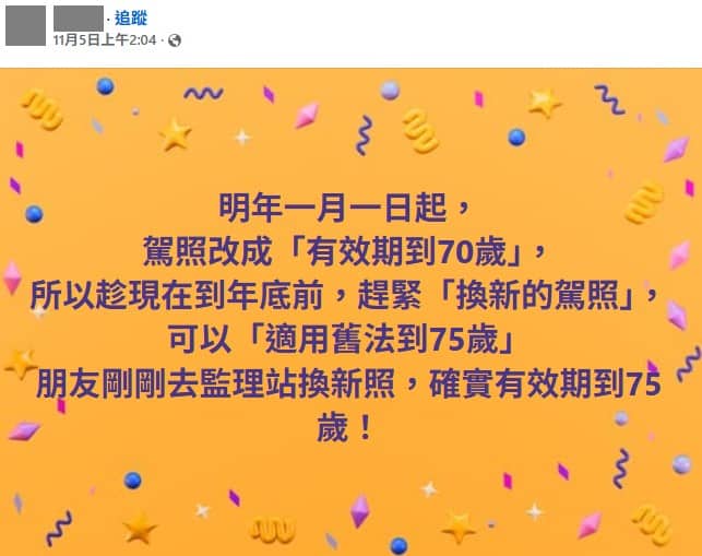 今年上半年發生高齡駕駛者重大車禍事件,引發社會關注,交通部檢討並研擬修改高齡換照制度。近日社群平台流傳訊息稱「明年1月1日起駕照有效期改成70歲」,並呼籲高齡駕駛人趁現在到年底前趕緊去換新駕照,就可以適用舊法到75歲。