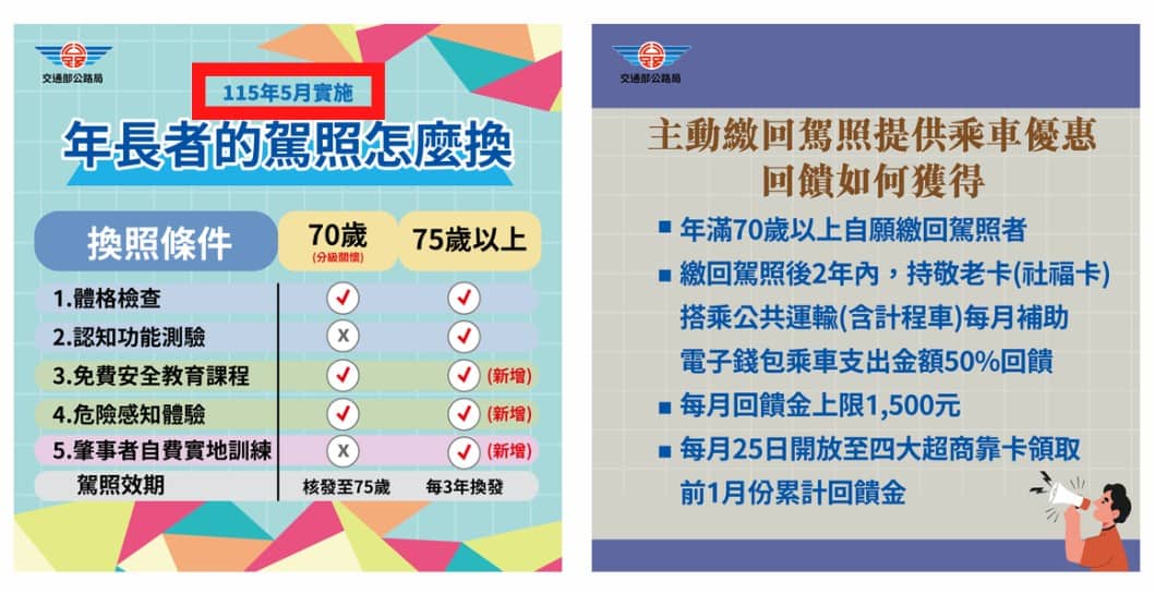 一、交通部公路局規劃的「高齡換照」新制將於2026年5月正式實施,並非傳言所說的2026年1月1日。屆時,年滿70歲駕駛須經體檢合格後換照使用至75歲,年滿75歲者維持每3年換照一次;若有肇事違規紀錄,需完成自費訓練後方可換照。