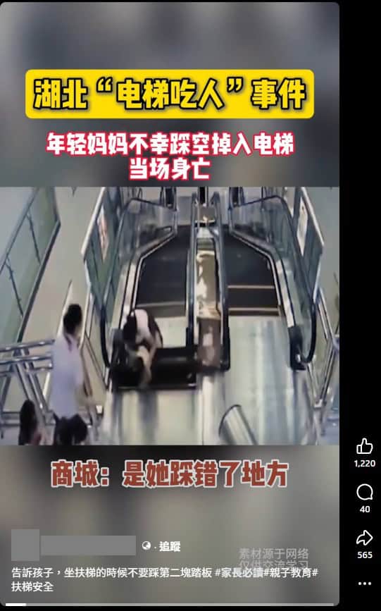 近日社群平台流傳一段電梯平台破洞、民眾掉下被捲入的影片,影片上壓字說明這是發生在中國湖北的「電梯吃人」事件,年輕媽媽不幸踩空掉入電梯當場身亡,並稱「是她踩錯了地方」;影片口白也提醒,不可以踩電扶梯的第二塊板子,因為下方是空的,若掉下會被捲入絞鏈。