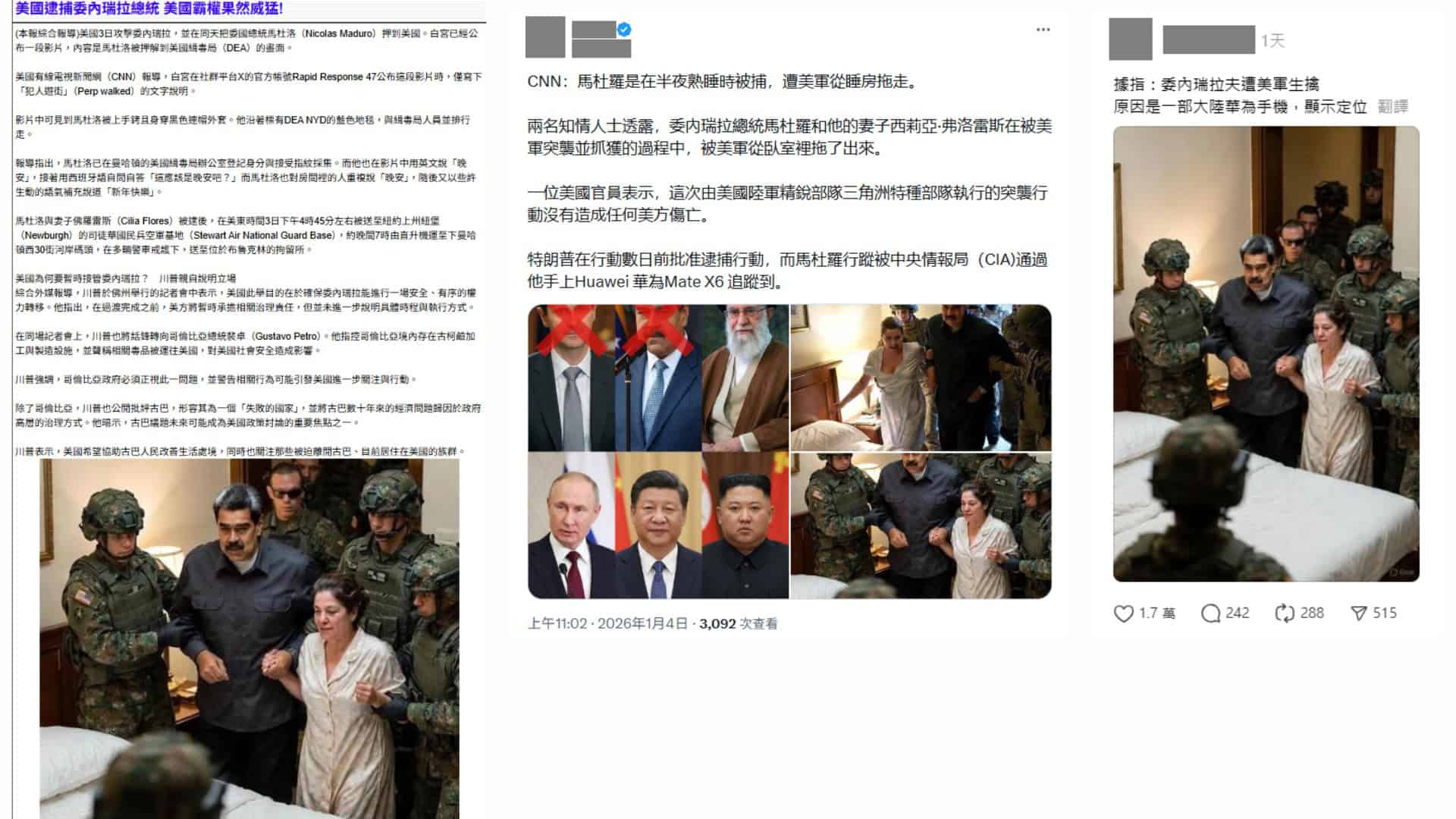 針對傳言稱「CNN報導馬杜洛與妻子被美軍從臥房拖走」,查核中心檢視《CNN》發布於1月3日的報導可知,有2名知情人士告訴《CNN》記者,馬杜洛及妻子是在睡夢中被美軍突襲逮捕,兩人被從臥室拖走,但CNN並未發布網傳圖片。