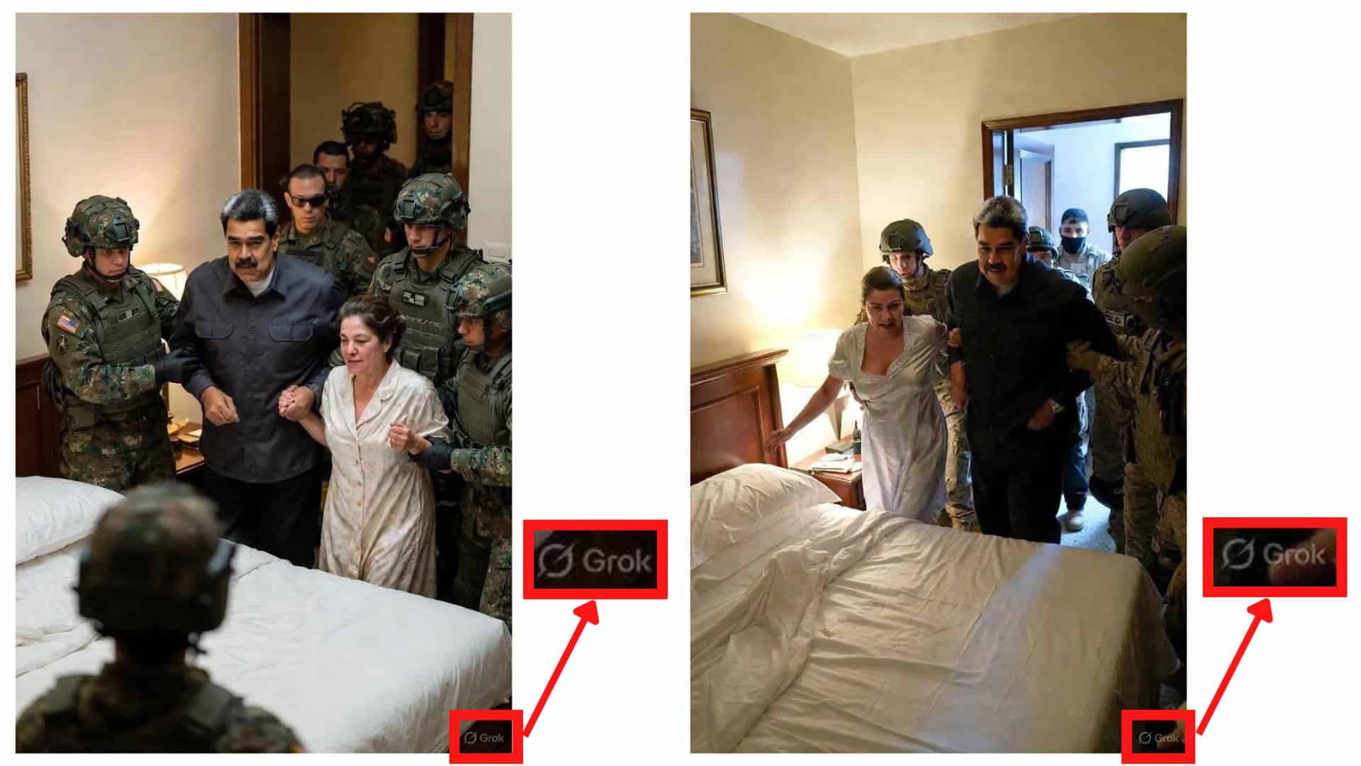 查核中心檢視網傳2張「委內瑞拉總統被美軍從臥房拖走」的圖片,可發現圖片右下角都有顯示「Grok」浮水印。Grok是馬斯克旗下的AI公司,由此可初步判斷網傳圖片應為AI生成。