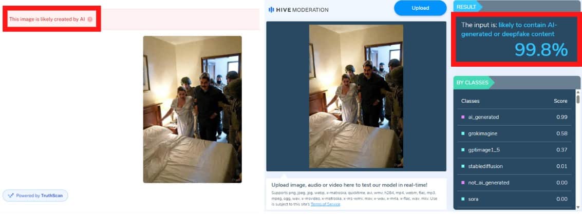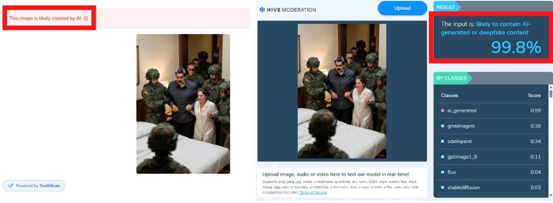 1月3日美軍逮捕委內瑞拉總統馬杜洛,網路旋即流傳2張聲稱為「馬杜洛及其妻子在臥室被美軍拖走」的圖片;經查證,各大國際通訊社及主流媒體均未發布網傳圖片,經檢測也可發現,網傳圖片為AI生成,並非真實影像。