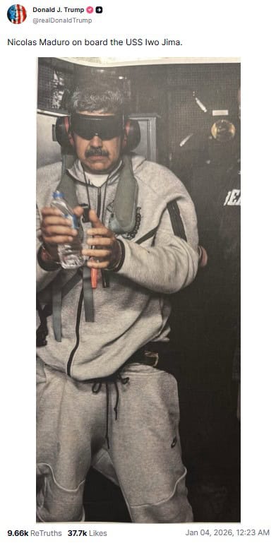 馬杜洛被捕後的首張照片是由美國總統川普的社群帳號所發布,照片中的馬杜洛穿著灰色運動服裝,戴上眼罩,雙手也被上銬,川普在貼文寫道「馬杜洛在美軍硫磺島號上」。