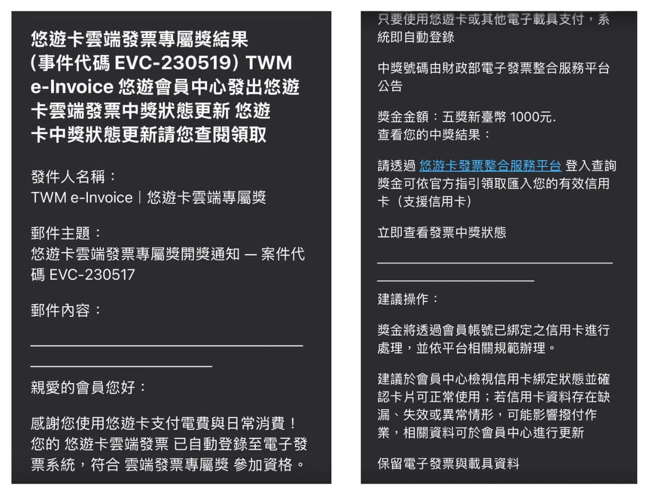 近期,部分民眾收到一封悠遊卡雲端發票中獎通知信件,寄件人顯示「TWM e-Invoice 悠遊卡會員中心」並在信中提供「悠遊卡會員中心登入查詢」的連結,要求民眾登入查詢獎金並匯入信用卡。