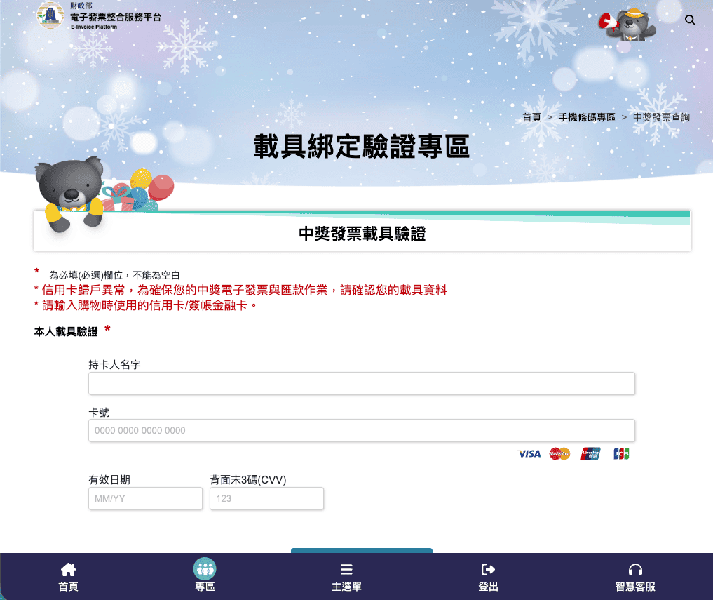 實際打開網傳連結測試,網站要求輸入手機號碼及驗證碼。查核記者虛構數字輸入,卻仍能成功進入「載具綁定驗證專區」,並不合理。該頁面隨後顯示因信用卡歸戶異常,並要求輸入信用卡持卡人姓名、卡號、有效期限及驗證碼。
