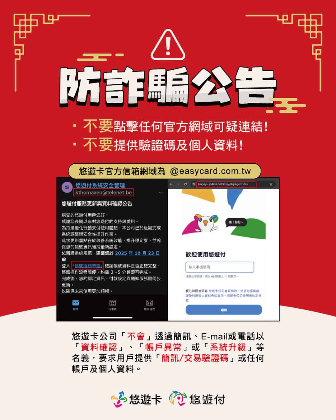 (二)悠遊卡公司2月24日在臉書粉專公告,悠遊卡公司不會透過簡訊、E-mail或電話方式,以「發票中獎」等名義要求或通知用戶,提供「簡訊/交易驗證碼」或任何帳戶及個人資料,請用戶切勿點選不明連結或信件填寫任何個人資料、帳戶資訊或其他機敏資料,以免落入詐騙集團的陷阱。