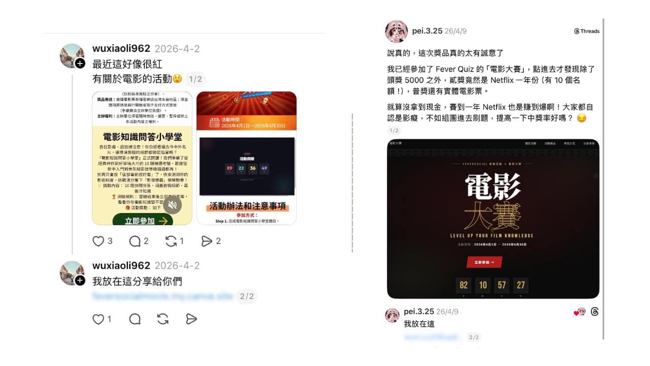 近期Threads上有許多分享電影活動的貼文,強調只要「填答問卷」就能參加抽獎,獎項包括現金5000元、Netflix一年份會員、實體電影票等,並在留言處附上網址,邀請網友參加。