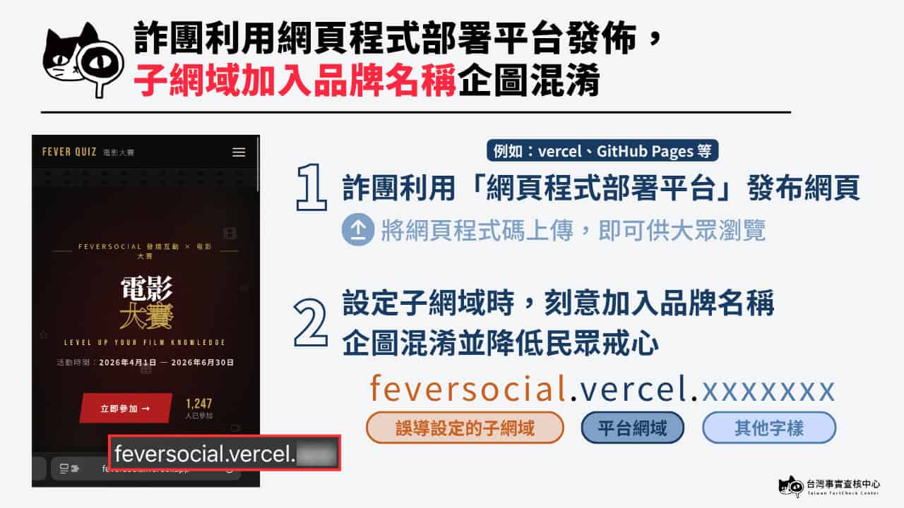 (三)詐騙網站利用Canva、Vercel平台發佈,並將假冒品牌當作子網域名稱,企圖混淆視聽。FeverSocial提醒,該公司的正確網域只有「feversocial.com」,網傳網頁並非透過公司發布。