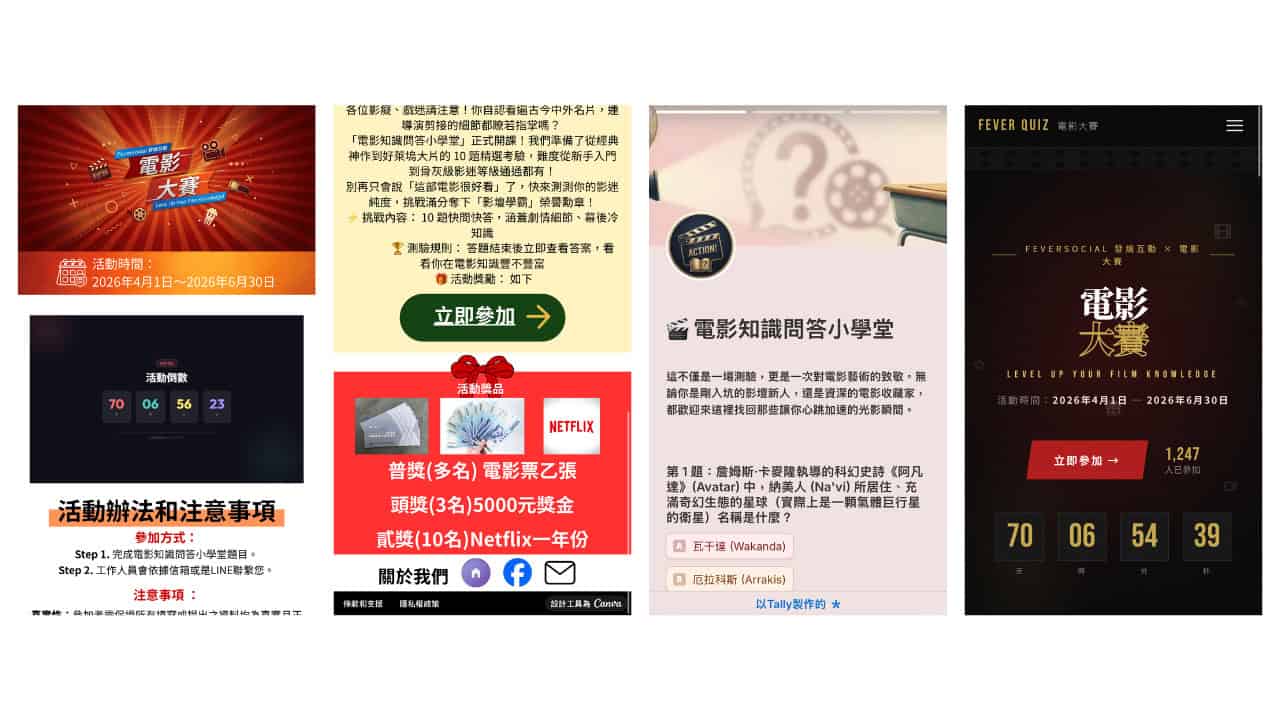 近期網路流傳「FeverSocial電影大賽」的抽獎活動,宣稱完成問答並填妥個人資料,就有機會抽到電影票、Netflix會員等多項好禮。這是詐騙網頁,並非FeverSocial(發燒互動)舉辦的活動。