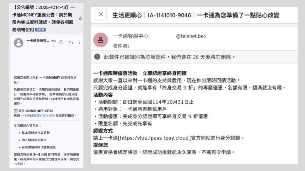 近期有民眾收到自稱來自一卡通客服中心的電子郵件,內容要求用戶須在期限內至官方網站完成資料確認,以確保服務功能正常運作。另有電子郵件版本宣稱用戶只要透過信中連結進行身分認證,便可獲得「終身交易9折」的專屬優惠。