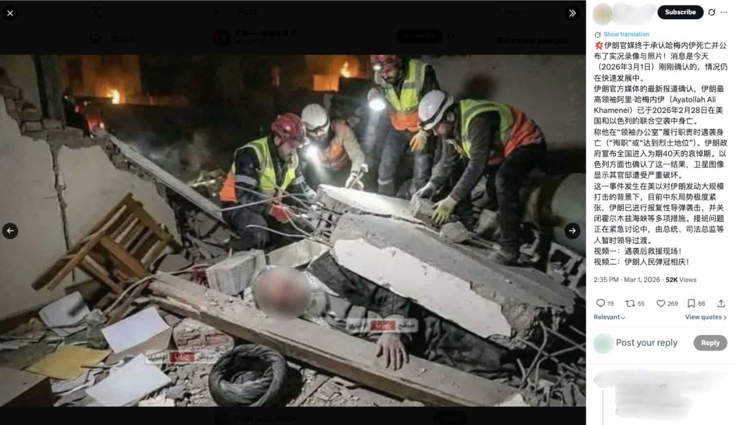 隨後社群平台流傳圖片宣稱「伊朗官媒終於承認哈梅內伊死亡並公佈了實況錄像與照片」,畫面顯示一名臉部經馬賽克處理的人物被壓在建築物碎片之下。另外,也有人物臉部未經馬賽克的圖片版本。
