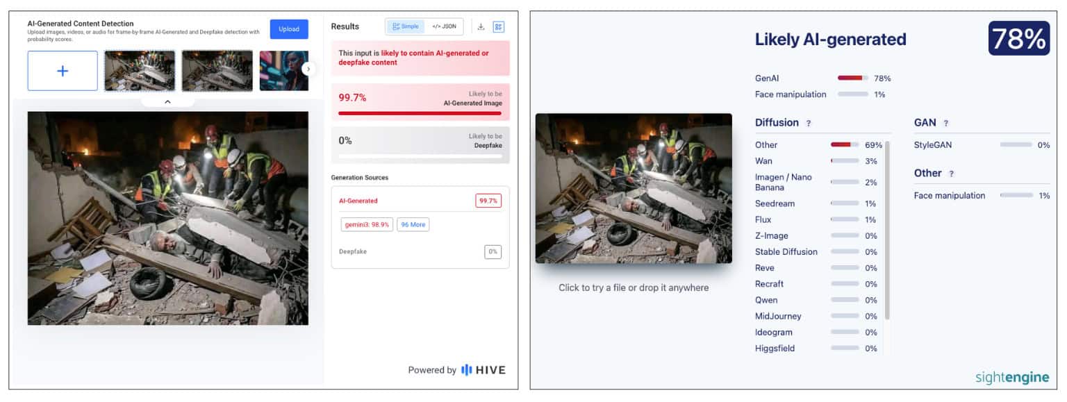二、透過AI生成圖像檢測工具《Hive Moderation》、《Sightengine》,檢測結果均顯示網傳圖片有高機率為AI生成。