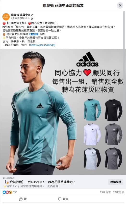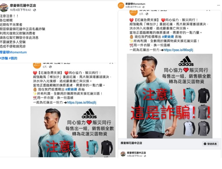 近期臉書流傳一則以「摩曼頓 花蓮中正店」名義發布的貼文,宣稱低價釋出愛迪達長袖,所有利潤全數用於購買物資支援花蓮災區。