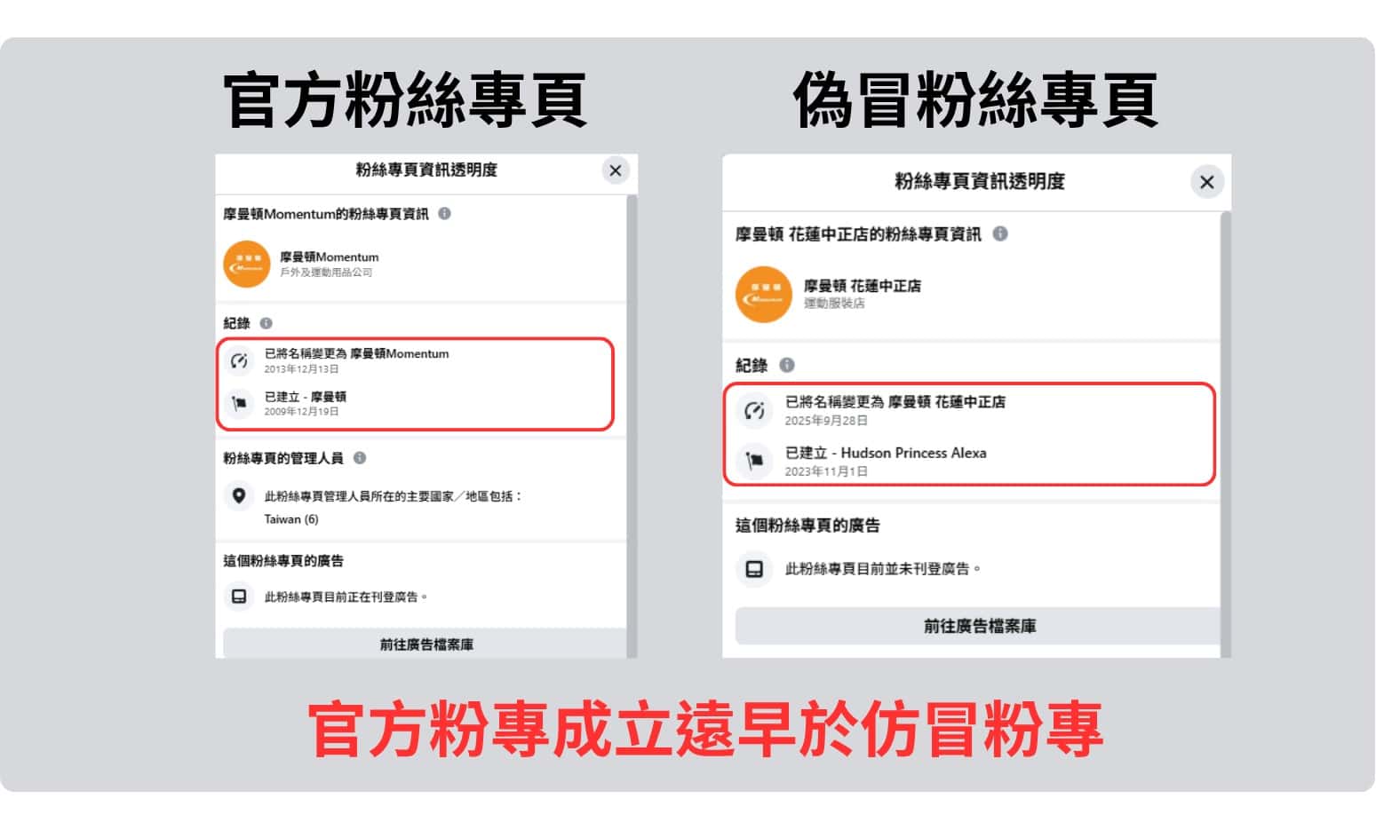 根據「粉絲專頁資訊透明度」可見,該偽冒粉專成立時間為2023年11月1日,當時名稱還是未知名稱「Hudson Princess Alexa」,是在今年9月28日才改名「摩曼頓 花蓮中正店」;「摩曼頓 花蓮中正店」官方粉絲專頁成立時間則為2014年4月22日,遠早於偽冒粉絲頁。