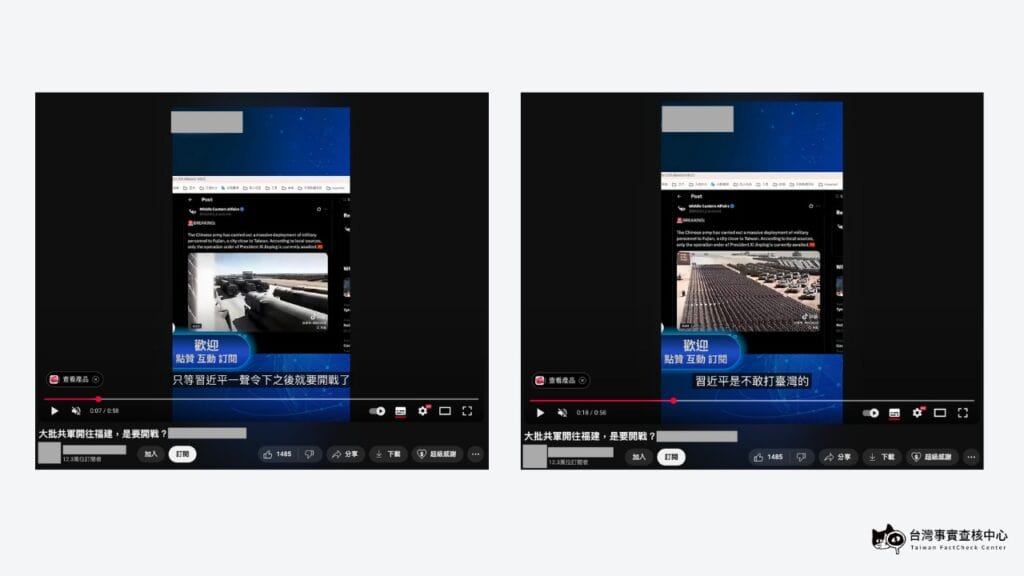 社群平台YouTube流傳一段標題為「大批共軍開往福建,是要開戰?」影片,內容引用X某帳號的兩段畫面,分別為飛彈運送與士兵畫面,並稱「看到一個推文……就是大批的共軍正在開往福建……當地的人說只等習近平一聲令下之後就要開戰了」。