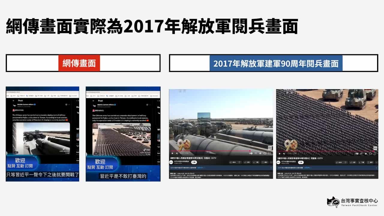 一、傳言影片畫面實際為2017年解放軍閱兵畫面,並非傳言宣稱「共軍集結福建」。另檢視中國官媒、台灣媒體與國際通訊社,也沒有出現傳言宣稱的報導訊息。